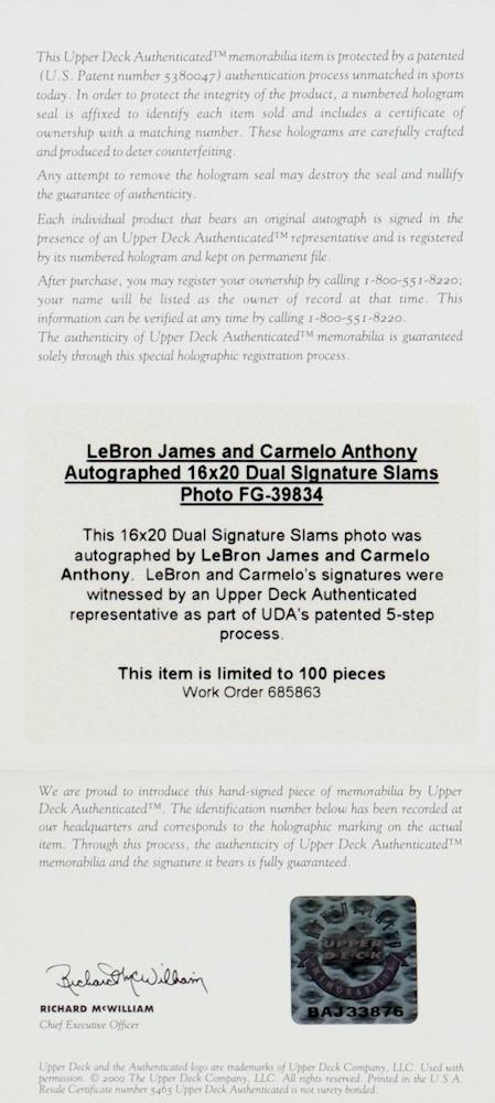 Custom frame measures 22" x 26" in size and features a 16" x 20" photo, an Upper Deck "Signature Slams" limited edition photo that has been hand-signed by LeBron James and Carmelo Anthony! This item is limited edition and has been hand-numbered #66/100.