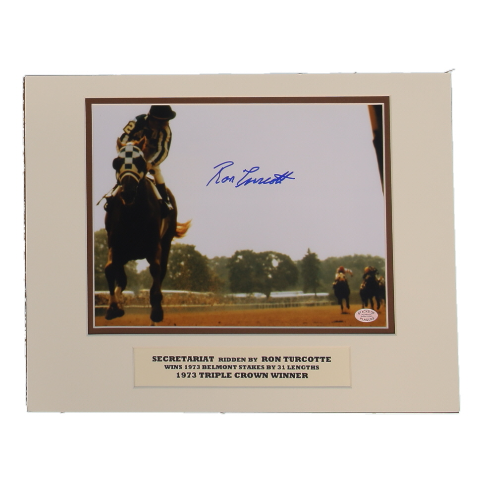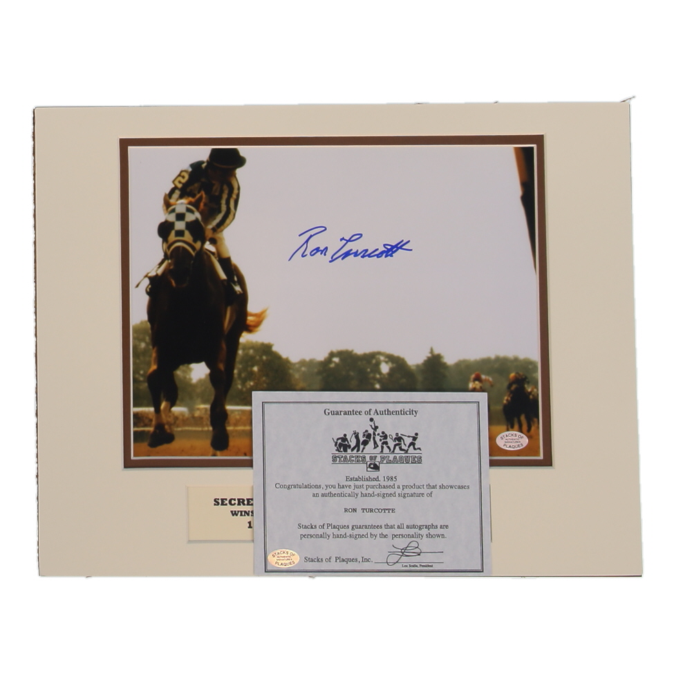 Custom matted display measures 11" x 14" in size and features a photo that has been hand-signed by Ron Turcotte. Display also includes an unsigned name plaque.