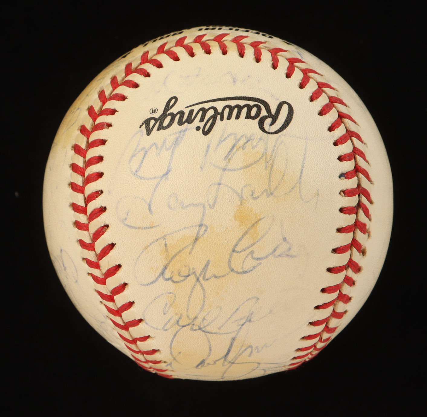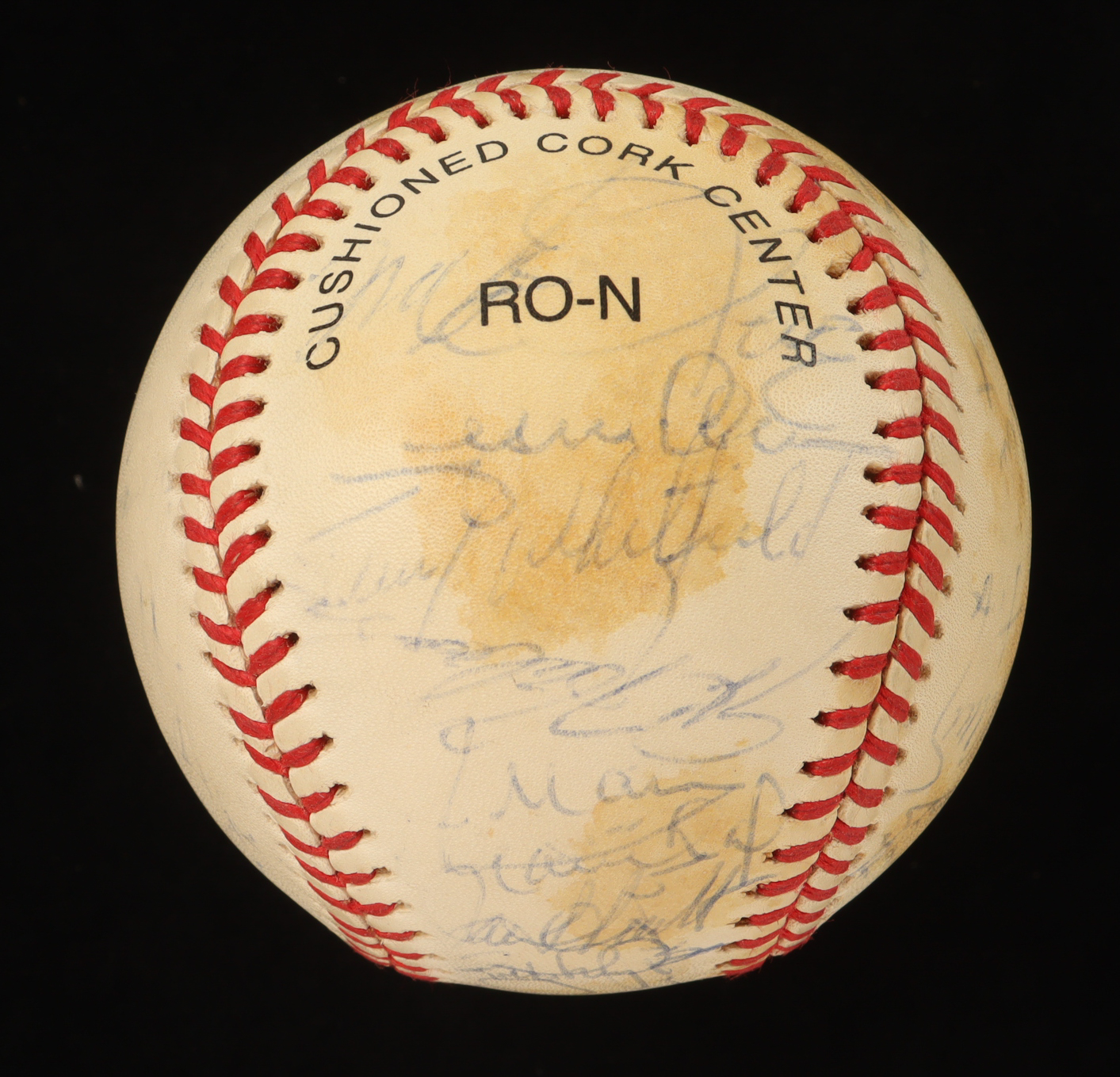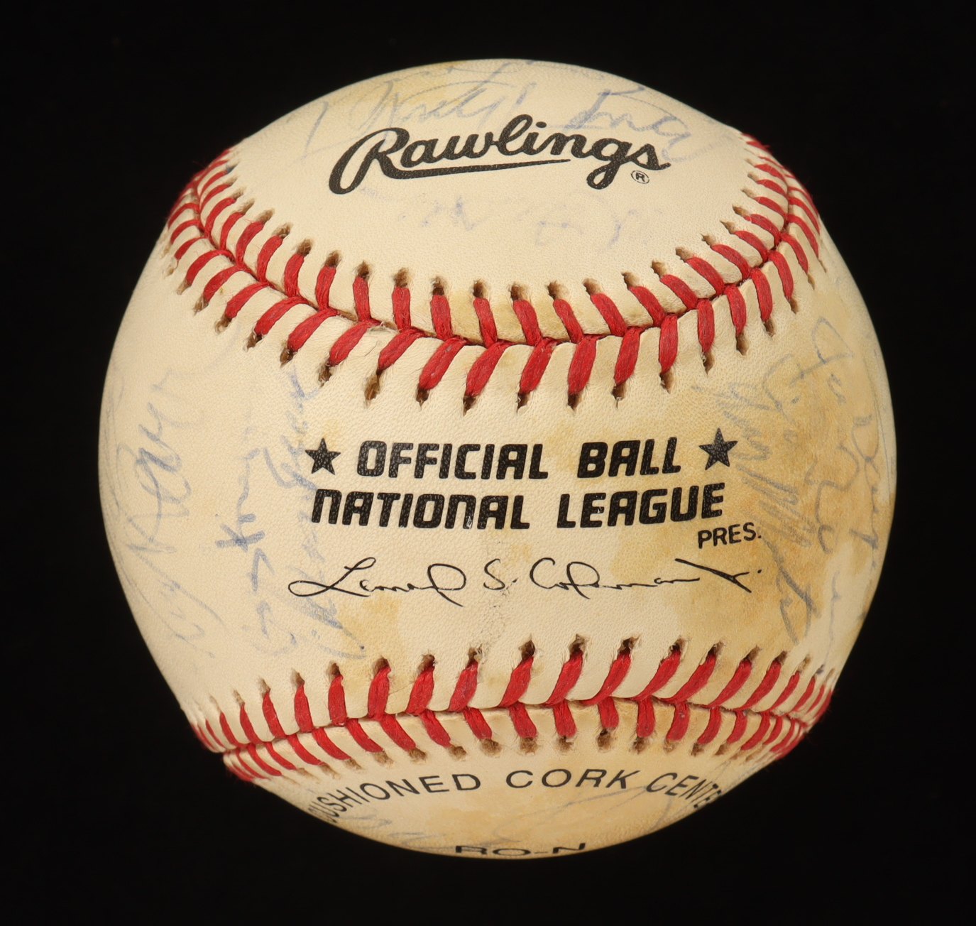 Rawlings Official National League baseball. Hand-signed by (32) with Bill Rigney, Vida Blue, Al Rosen, Juan Marichal Jesus Alou, Jim Barr, Brett Butler, Roger Craig, Jim Davenport, Dave Dravecky, Charlie Fox, Herman Franks, Atlee Hammaker, Cleon Jones, Brian Kingman, Dave Kingman, Mike Lacoss, Hobie Landrith, Gary Lavelle, Dennis Littlejohn, Bill Madlock, Greg Minton, Ed Plank, Chris Speier, Robby Thompson, Terry Whitfield and (6) others. Note that the display case is included in the listing as shown above and the item and signatures show signs of fading.