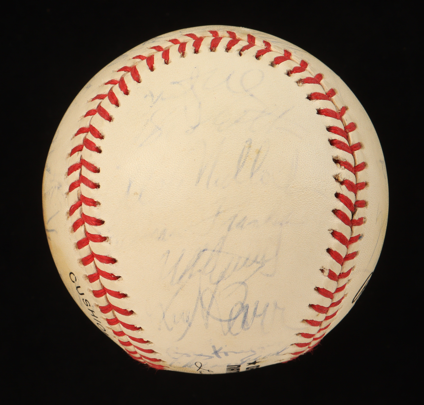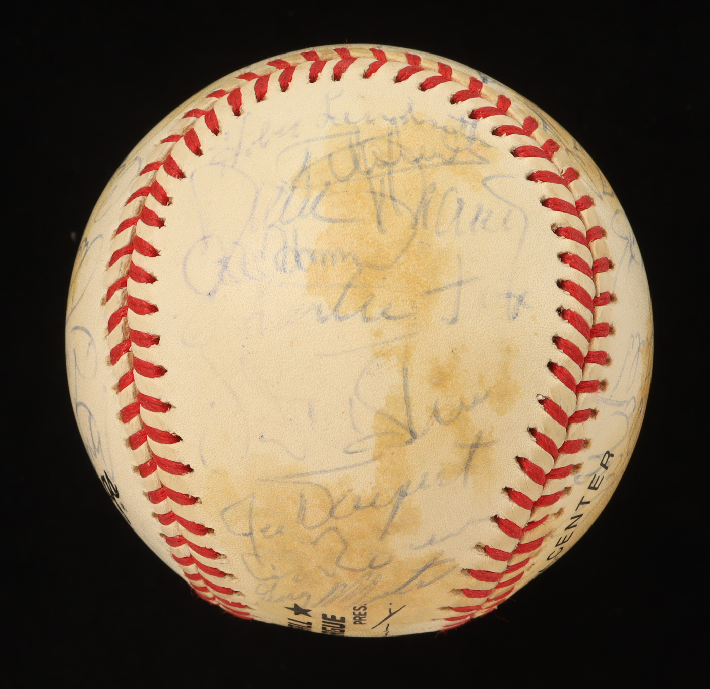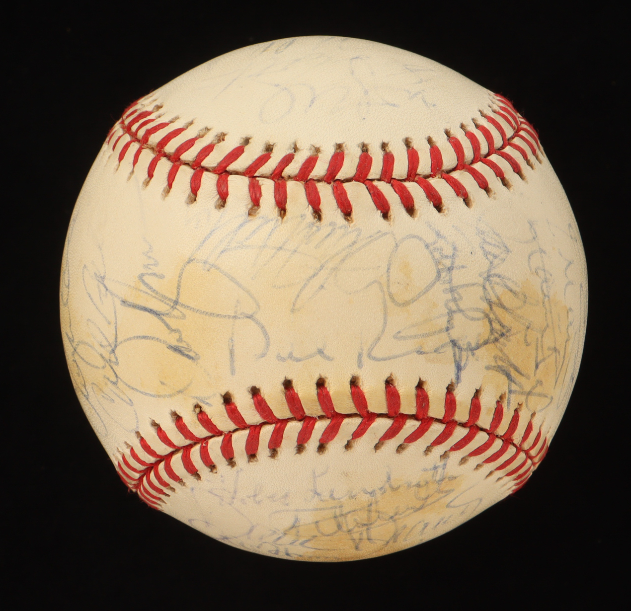Rawlings Official National League baseball. Hand-signed by (32) with Bill Rigney, Vida Blue, Al Rosen, Juan Marichal Jesus Alou, Jim Barr, Brett Butler, Roger Craig, Jim Davenport, Dave Dravecky, Charlie Fox, Herman Franks, Atlee Hammaker, Cleon Jones, Brian Kingman, Dave Kingman, Mike Lacoss, Hobie Landrith, Gary Lavelle, Dennis Littlejohn, Bill Madlock, Greg Minton, Ed Plank, Chris Speier, Robby Thompson, Terry Whitfield and (6) others. Note that the display case is included in the listing as shown above and the item and signatures show signs of fading.