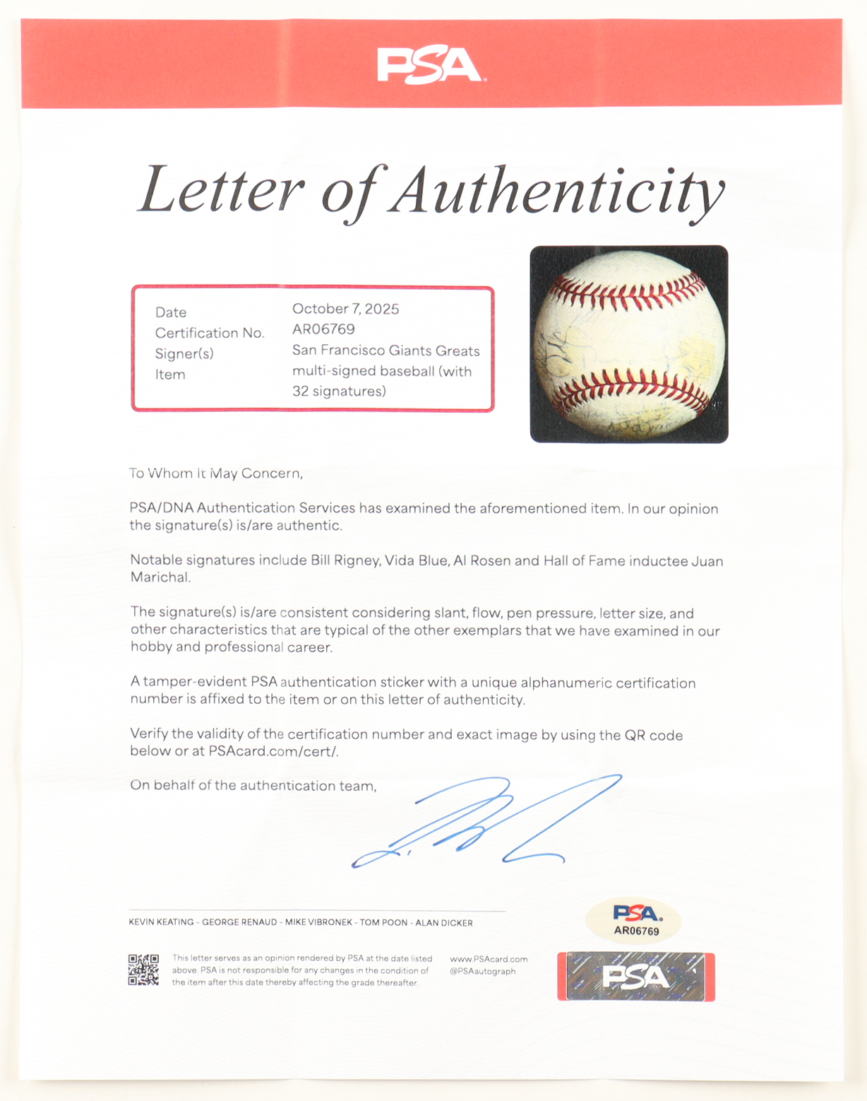 San Francisco Giants All Time Greats Signed ONL Baseball (32) with Juan Marichal, Al Rosen, Vida Blue, Bill Rigney with Display Case (PSA)