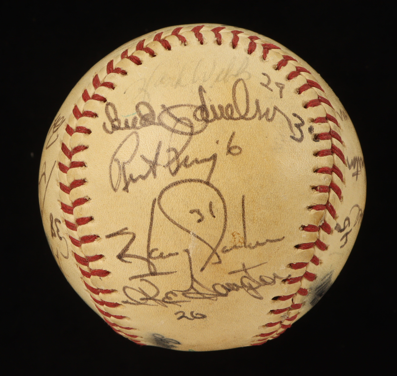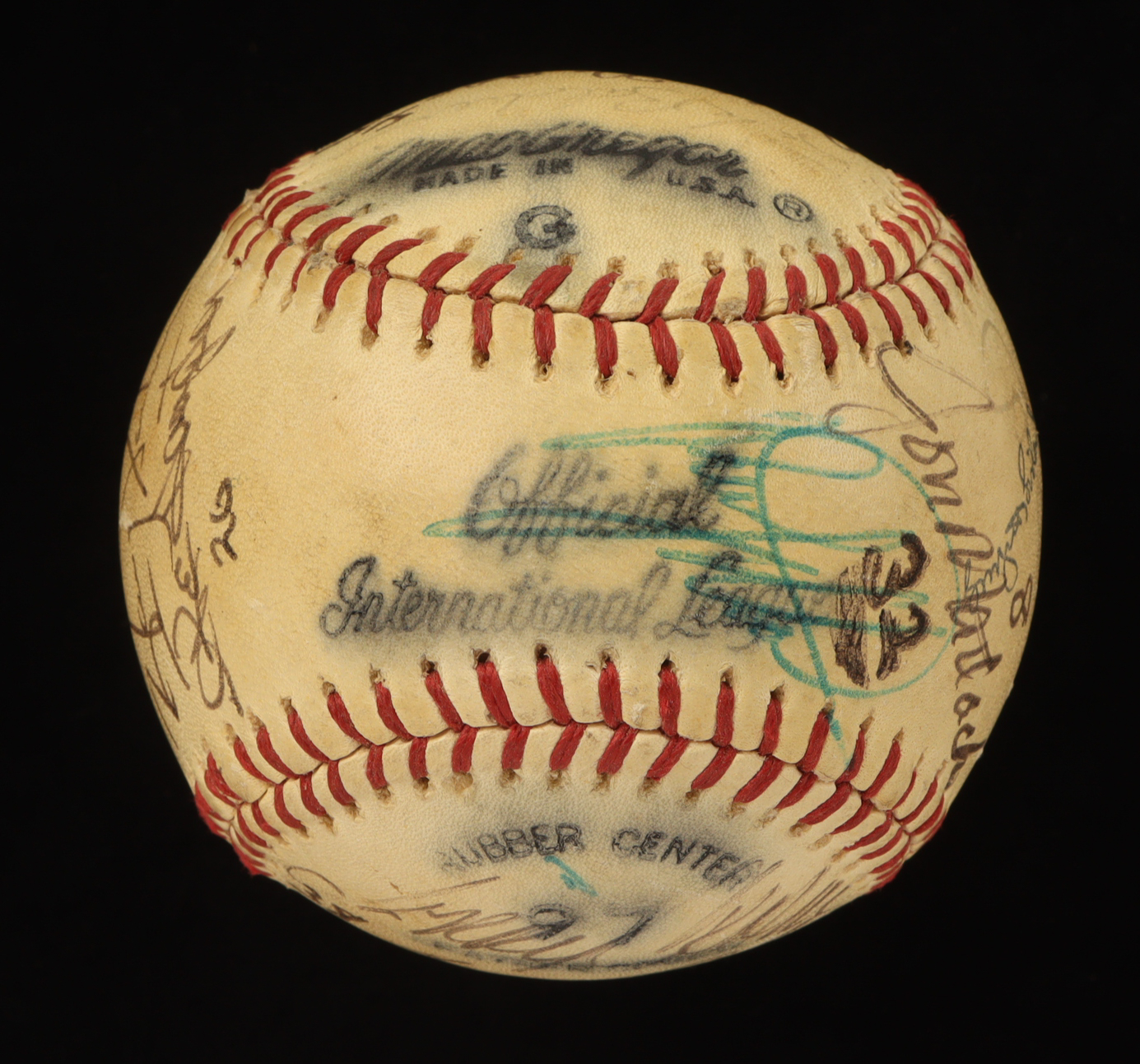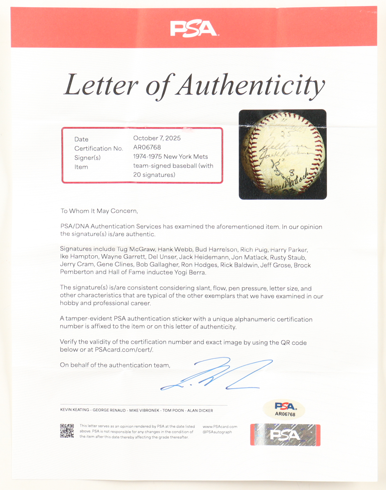 Official International National League baseball. Hand-signed by (20) with Tug McGraw, Hank Webb, Bud Harrelson, Rich Puig, Harry Parker, Ike Hampton, Wayne Garrett, Del Unser, Jack Heidmann, Jon Matlack, Rusty Staub, Jerry Cram, Gene Clines, Bob Gallagher, Ron Hodges, Rick Baldwin, Jeff Grose, Brock Pemberton and Yogi Berra (D. 2015, New York Yankees, HOF). Note that the display case is included in the listing as shown above and the item and signatures show signs of fading and natural toning.