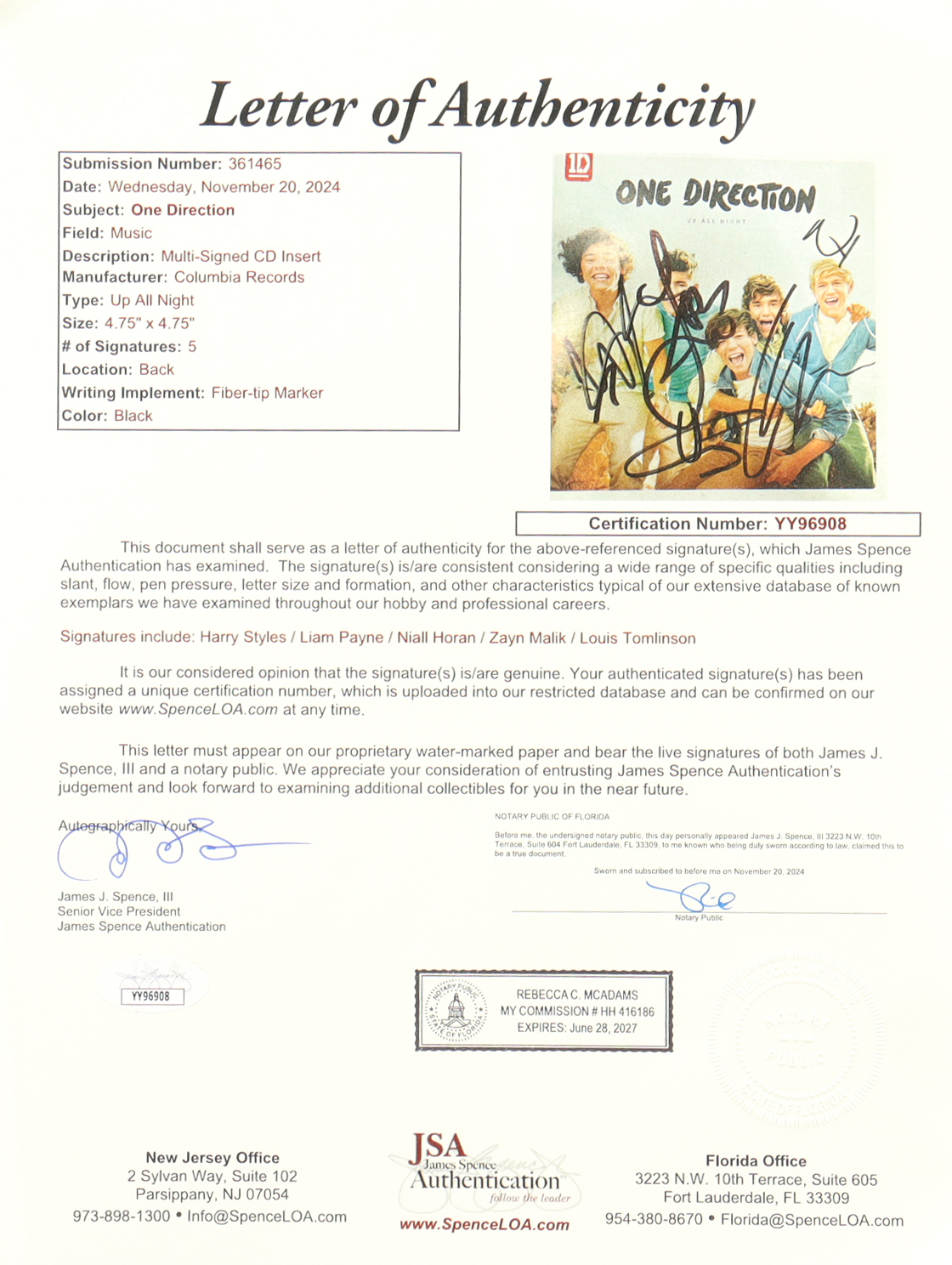 One Direction acoustic guitar measures approximately 38" in length and has been hand-signed on the CD cover, repurposed as a pickguard, by (5) Harry Styles, Liam Payne (D. 2024), Niall Horan, Zayn Malik and Louis Tomlinson.