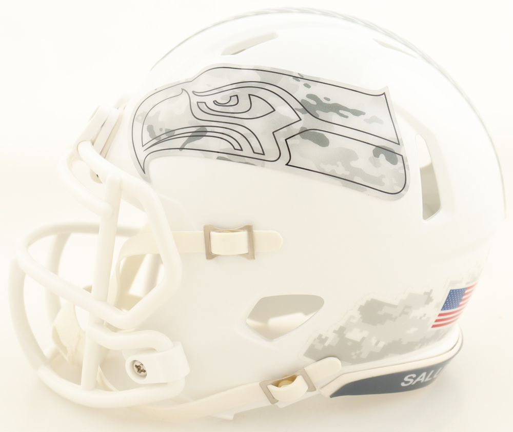 Riddell Seattle Seahawks Salute to Service Alternate Speed Mini Helmet. Hand-signed by Mike Macdonald. Please note, the signature has been smudged.