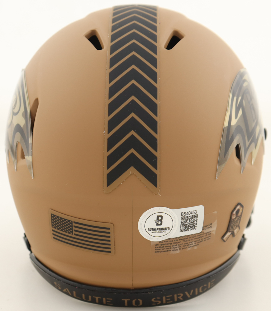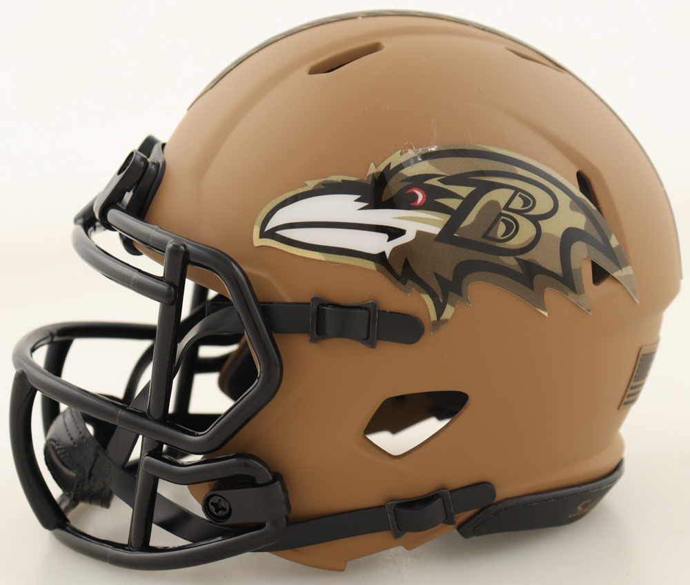 Riddell Baltimore Ravens Salute to Service Alternate Speed Mini Helmet. Hand-signed by Brian Billick. Please note, there is scuffing throughout the helmet.