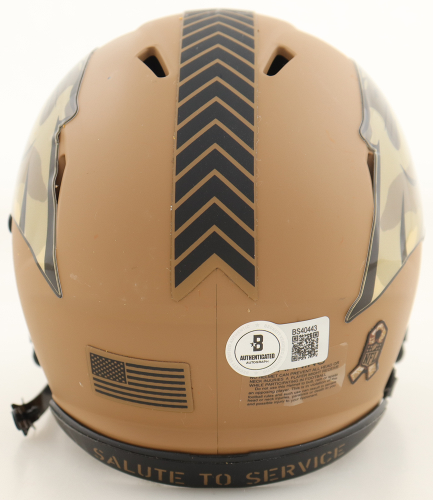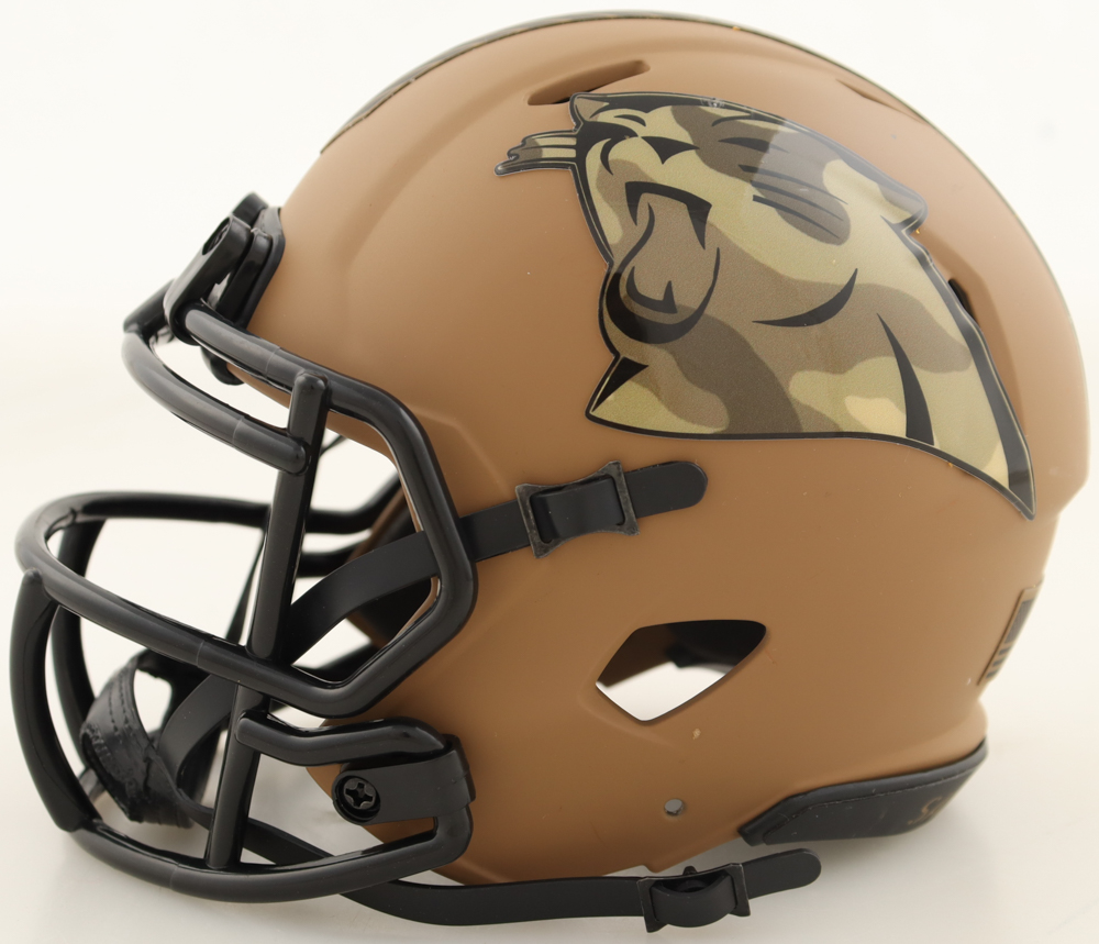 Riddell Carolina Panthers Salute to Service Alternate Speed Mini Helmet. Hand-signed by Dave Canales. Please note, there is scuffing throughout the helmet.