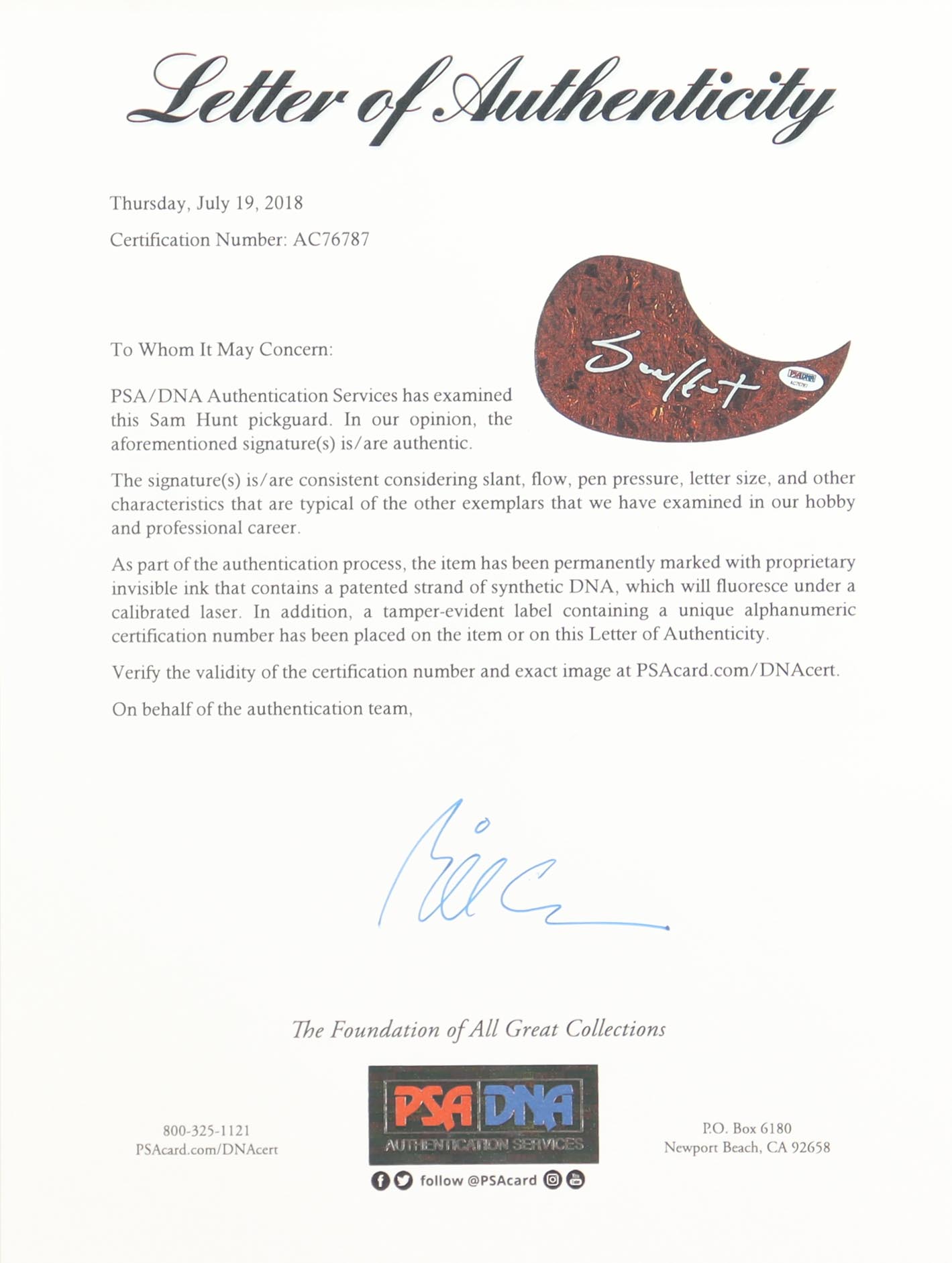 Acoustic guitar measures approximately 39" in length and has been hand-signed by Sam Hunt.