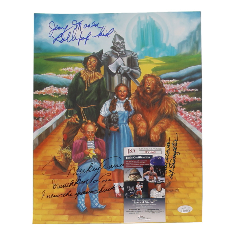 Print measures 11" x 14" in size and has been hand-signed and inscribed by Jerry Maren (D. 2018), Mickey Carroll (D. 2009), and Karl Slover (D. 2011).