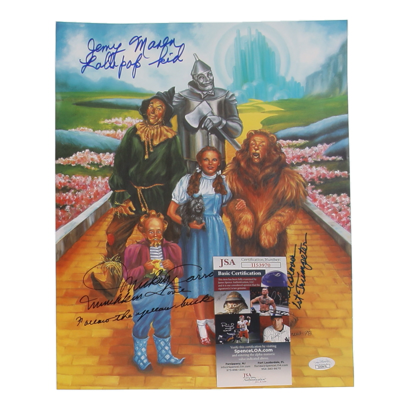 Print measures 11" x 14" in size and has been hand-signed and inscribed by Jerry Maren (D. 2018), Mickey Carroll (D. 2009), and Karl Slover (D. 2011).