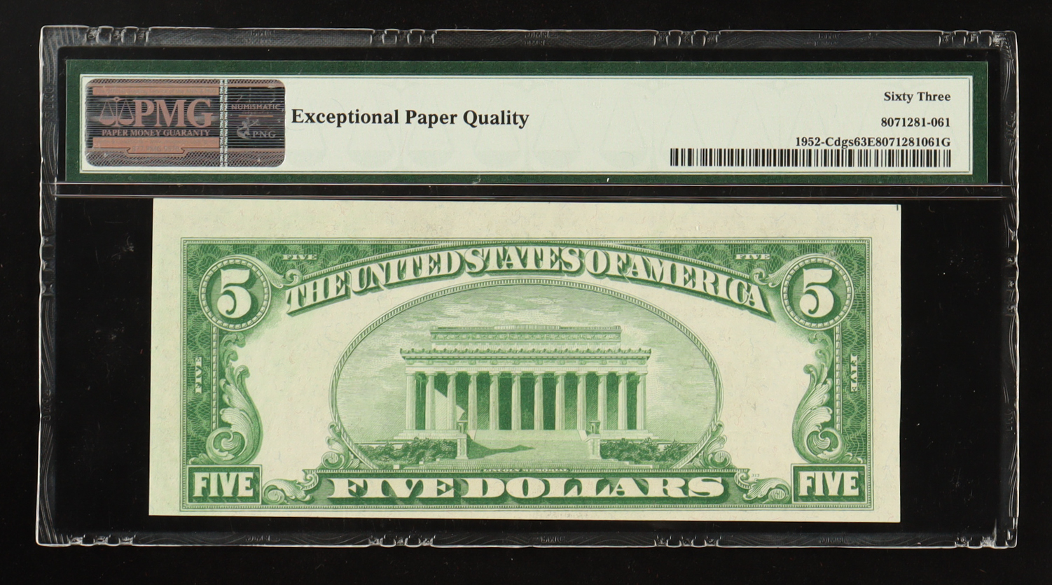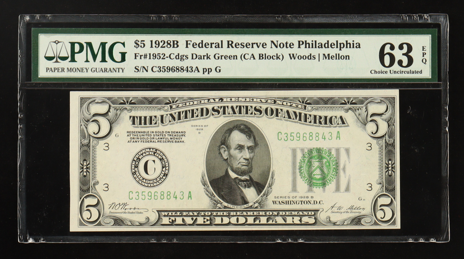 1928-B U.S. $5 Federal Reserve Note, Philadelphia - Fr. 1952 (CA Block) Signed: Woods / Mellon (PMG Choice Uncirculated 63 EPQ)