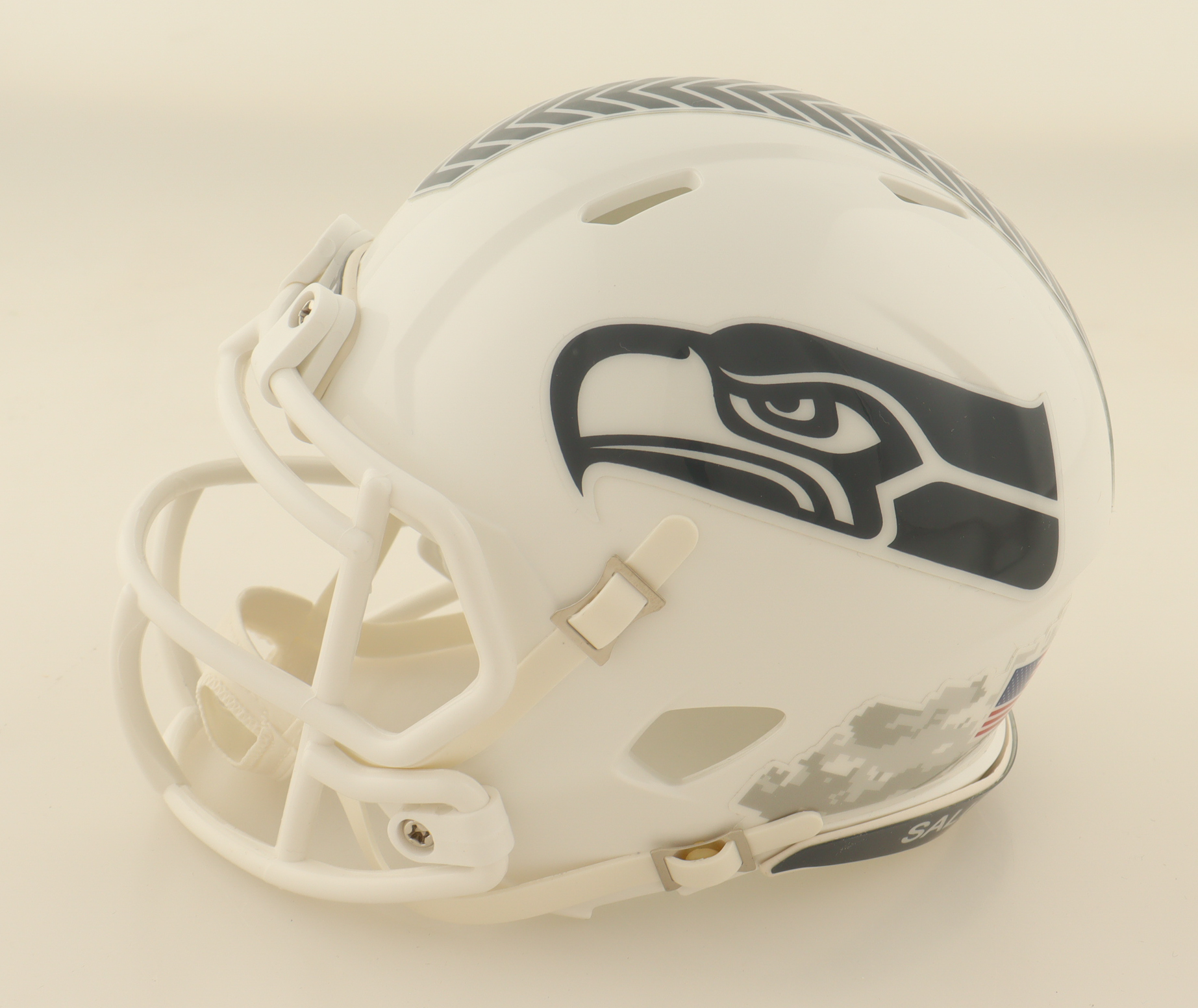 Riddell Seattle Seahawks Salute To Service Alternate speed mini helmet. Hand signed by Richard Sherman. Please note, signature has been smudged. Please refer to photos for more details.