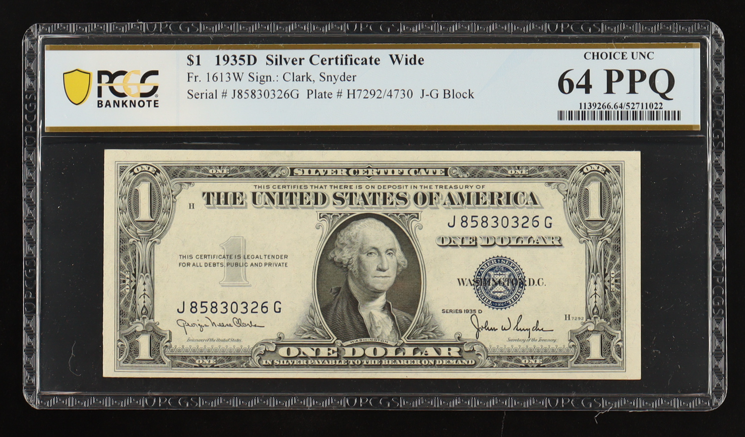 1935-D U.S. $1 Silver Certificate, Blue Seal - Fr. 1613W (J-G Block) Signed: Clark / Snyder (PCGS Choice Unc 64 PPQ)