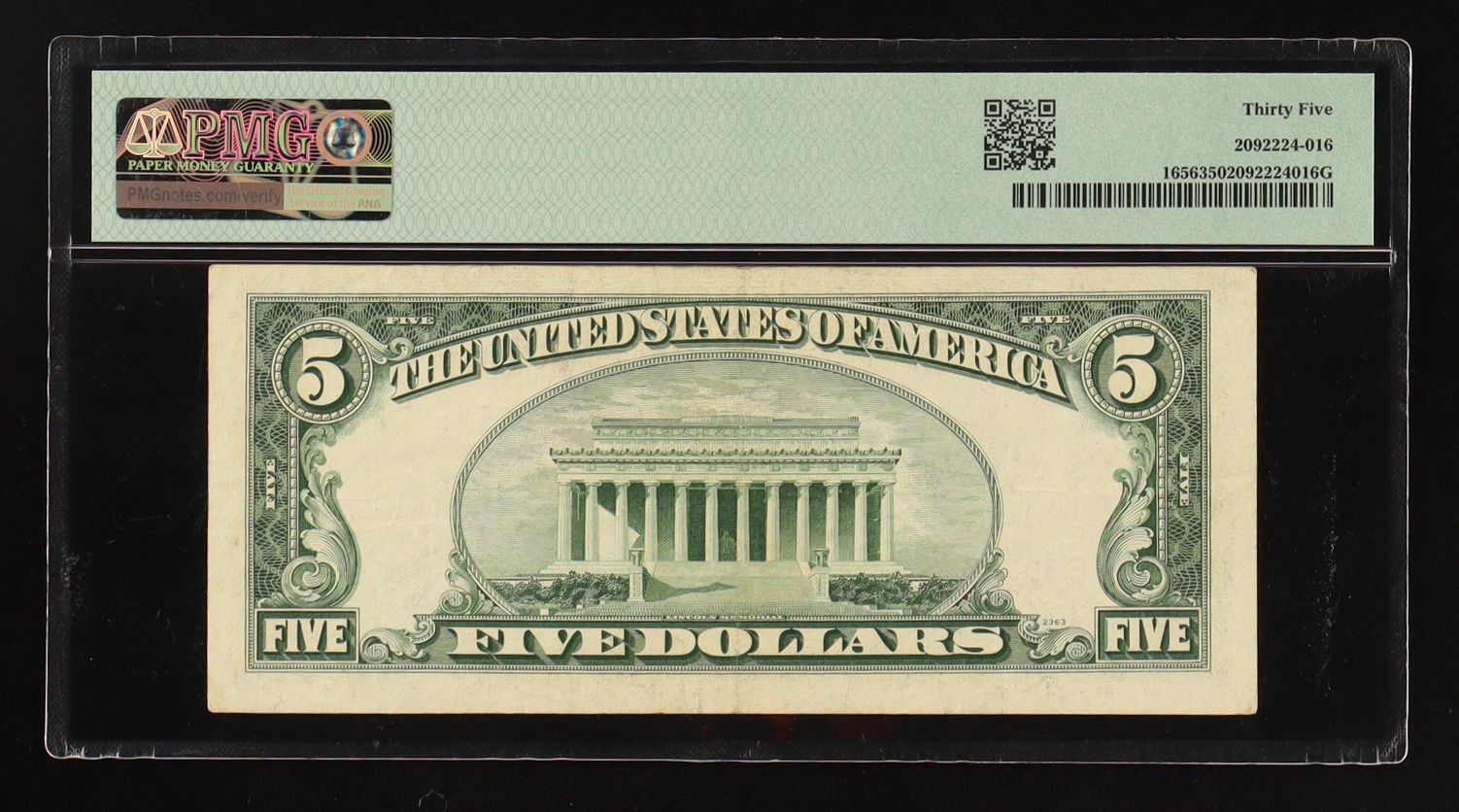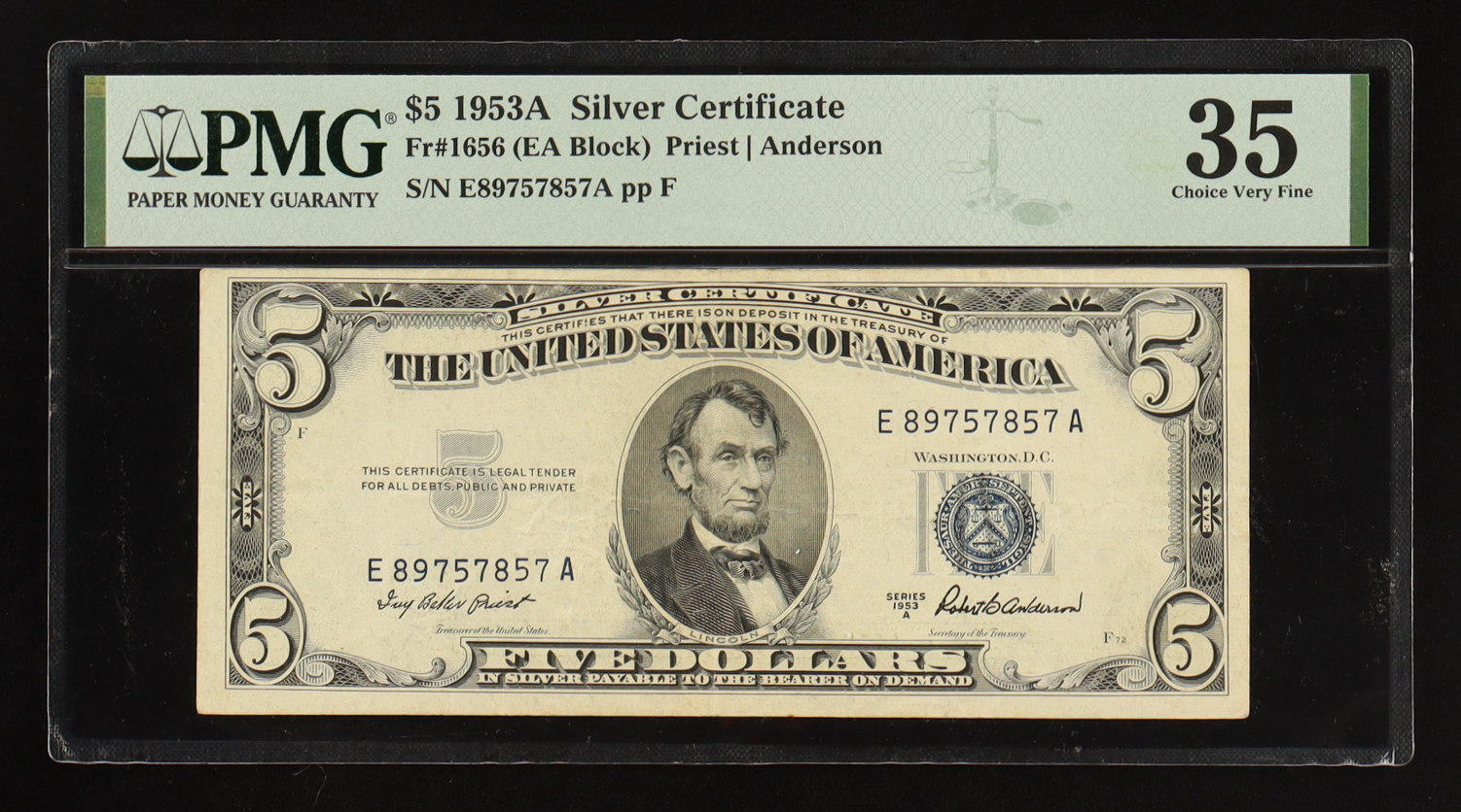 1953-A U.S. $5 Silver Certificate, Blue Seal - Fr. 1656 (EA Block) Signed: Priest / Anderson (PMG Choice Very Fine 35)
