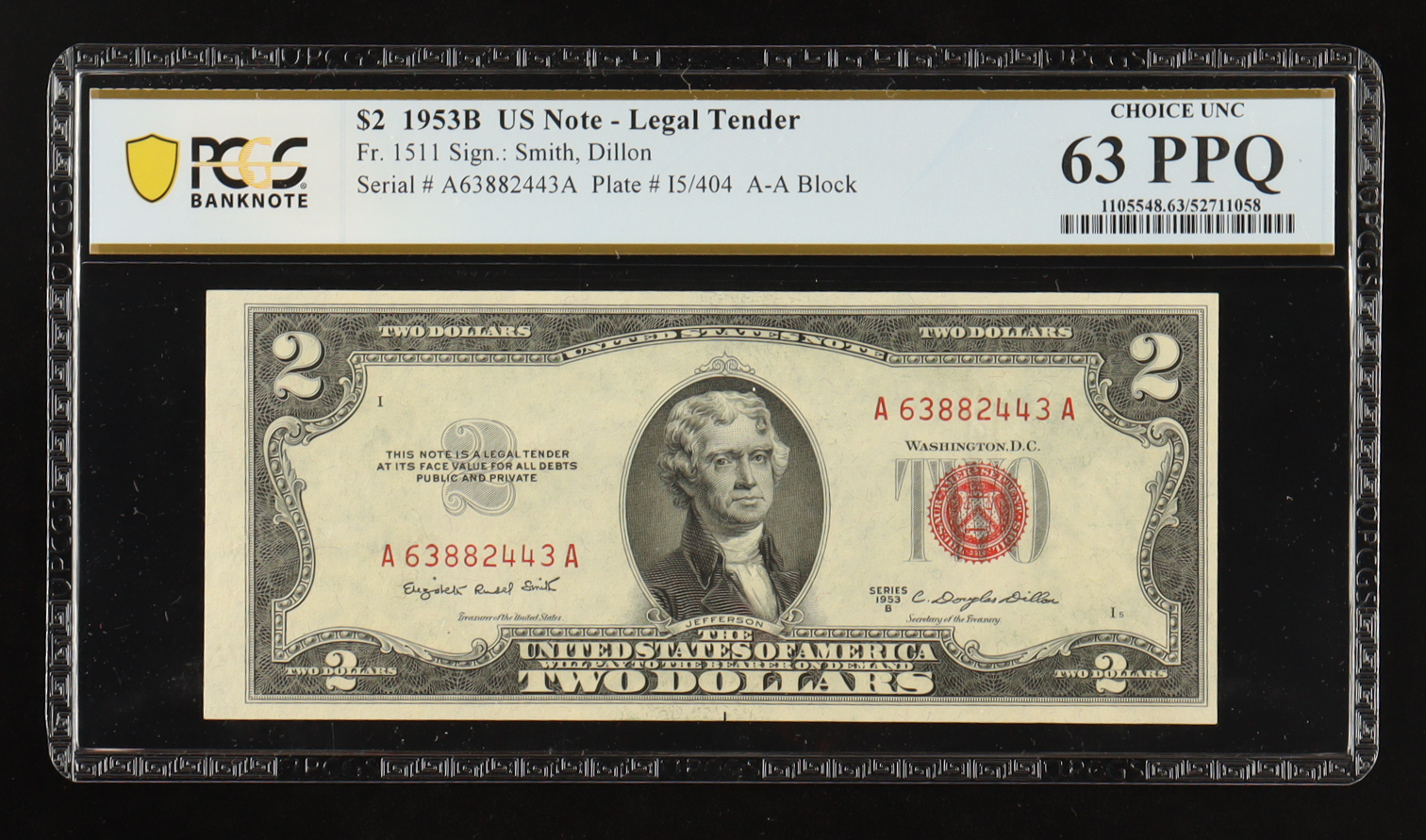 1953-B U.S. $2 Legal Tender Note, Red Seal - Fr. 1511 (AA Block) Signed: Smith / Dillon (PCGS Choice Unc 63 PPQ)
