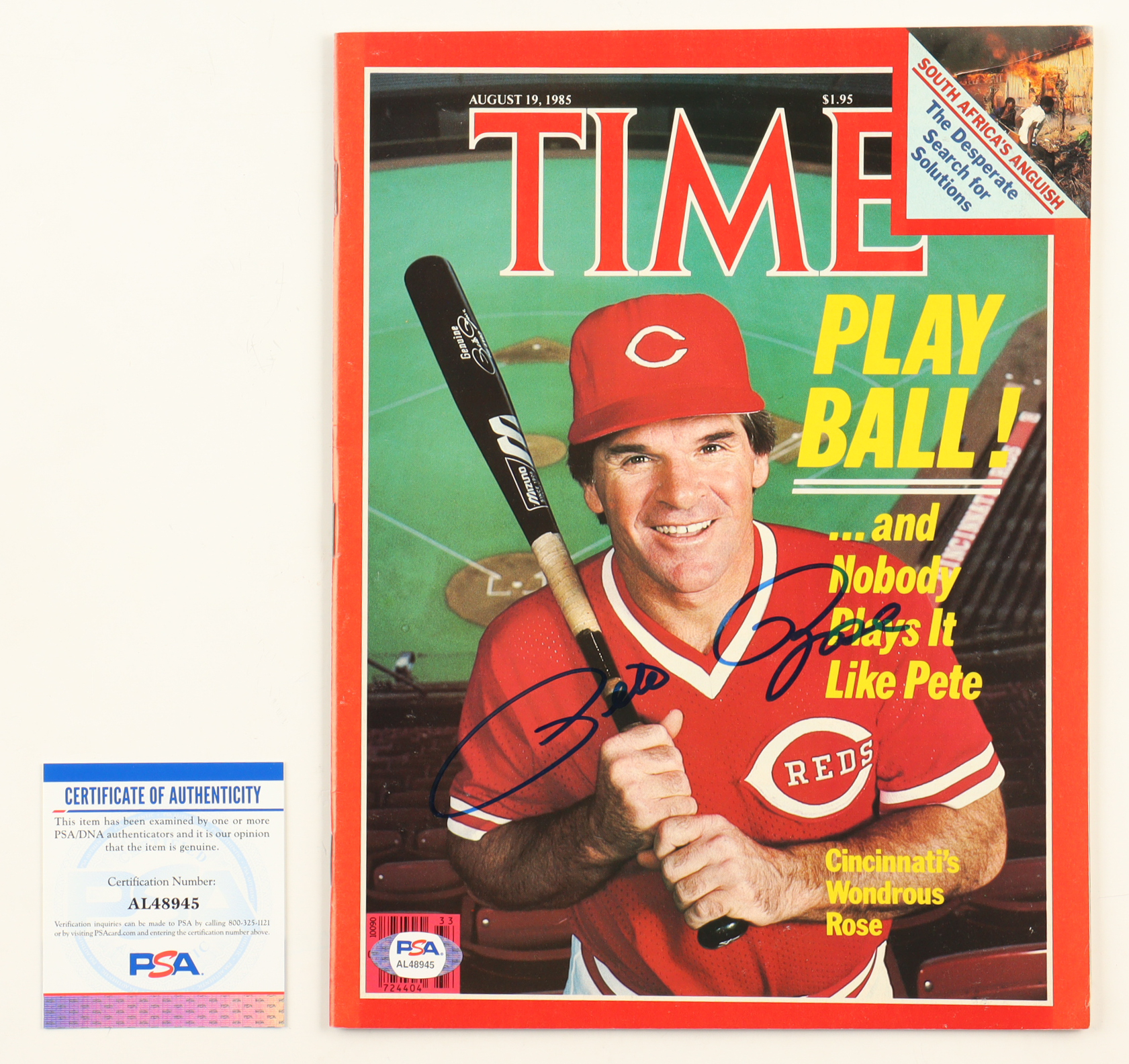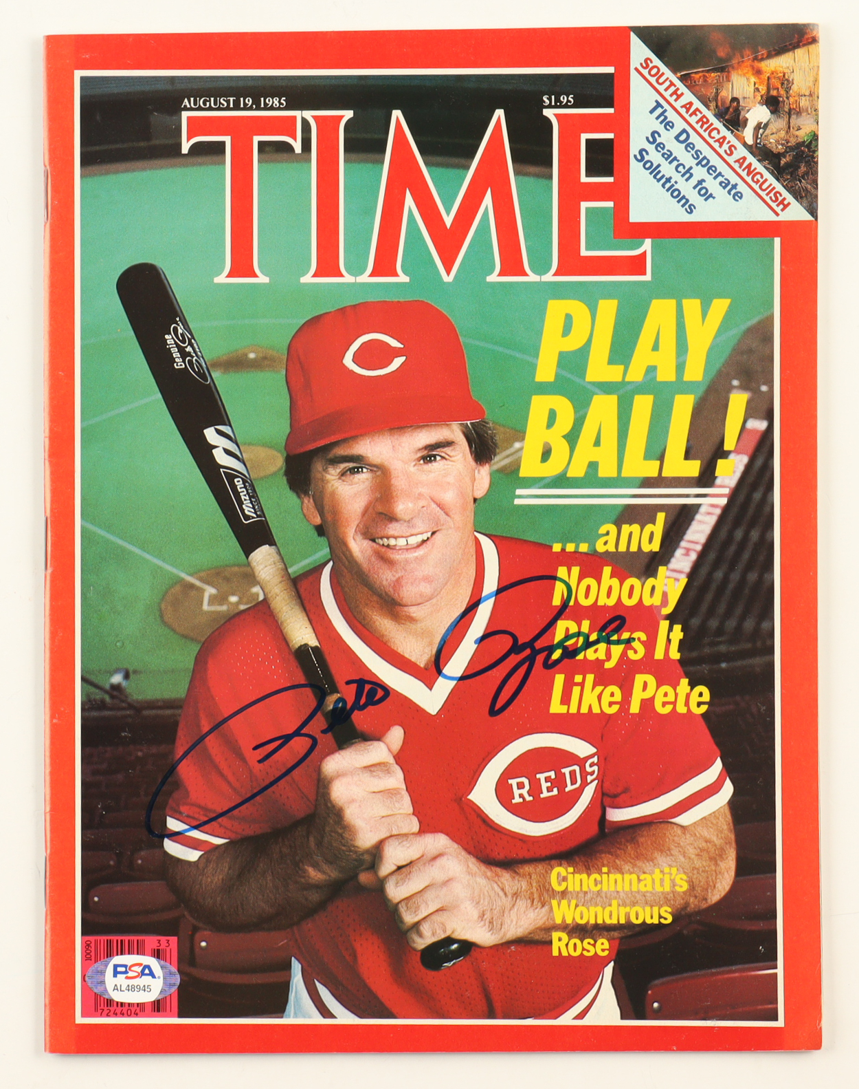 August 19, 1985 issue of Time Magazine is hand-signed on the cover by Pete Rose (d. 2024, Cincinnati Reds)