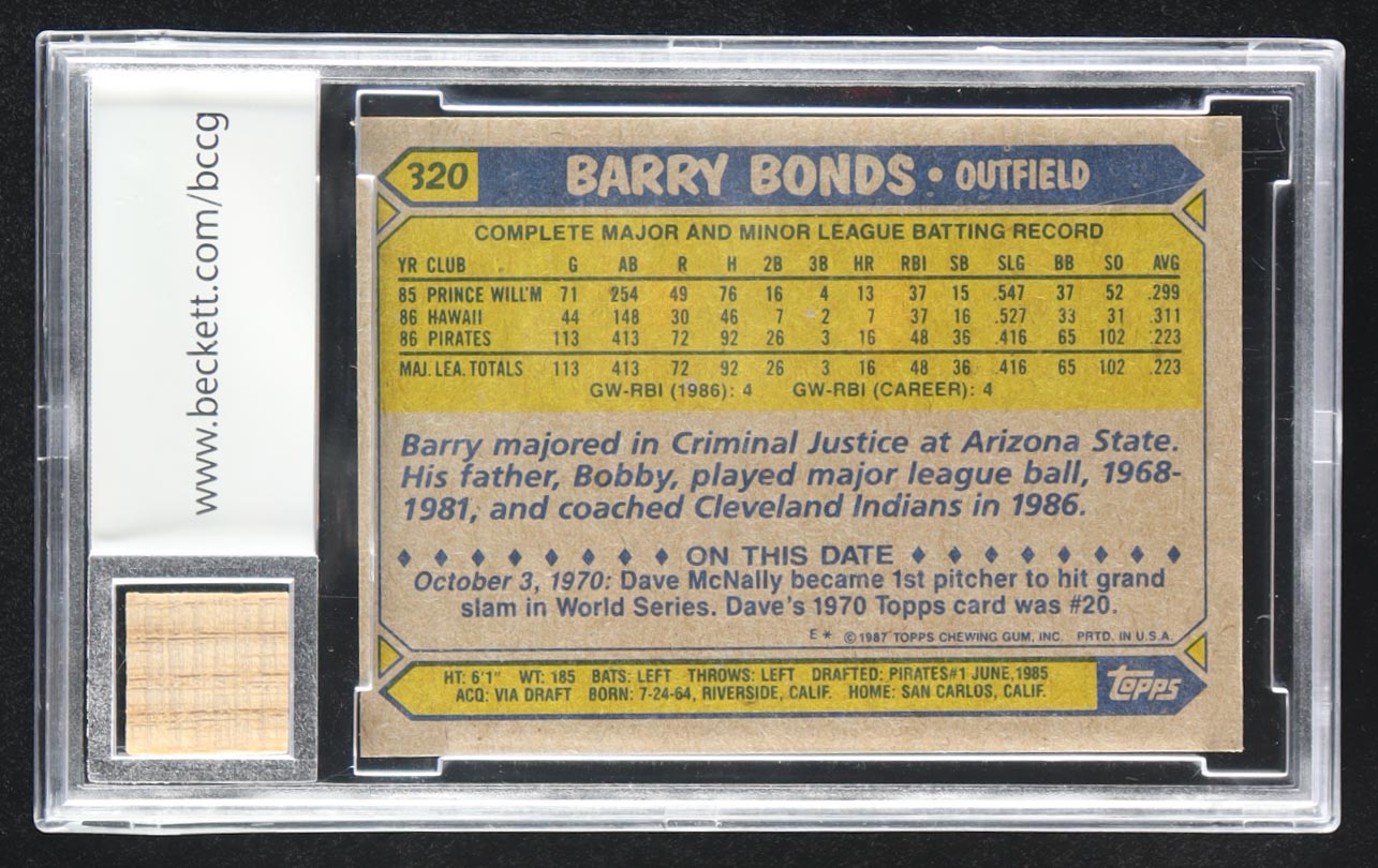 Barry Bonds 1987 Topps #320 RC With Game-Used Bat Relic #468/1987 (BCCG 10)