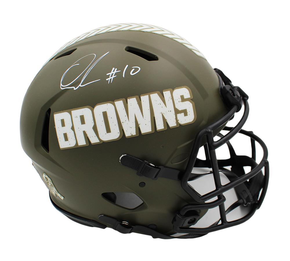 Riddell Cleveland Browns full-size authentic on-field salute to service alternate speed helmet. Hand-signed by Quinshon Judkins.