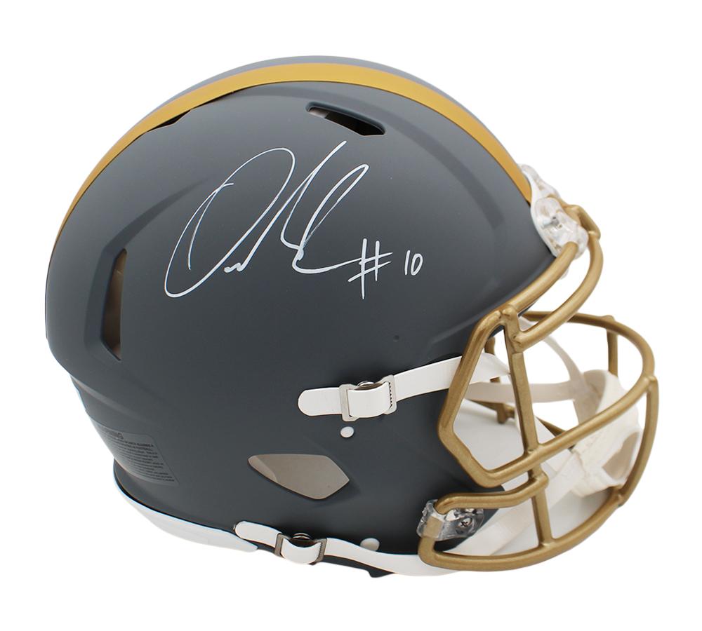 Riddell Cleveland Browns full-size authentic on-field slate alternate speed helmet. Hand-signed by Quinshon Judkins.