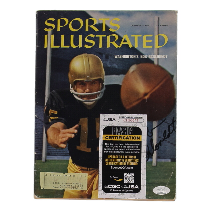 October 3rd, 1960 Issue of Sports Illustrated Magazine has been hand-signed on the front cover by Bob Schloredt (D. 2019, Washington Huskies). Please refer to photos for more details.