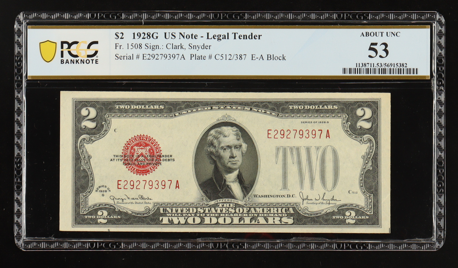 1928-G U.S. $2 Legal Tender Note, Red Seal - Fr. 1508 (EA Block) Signed: Clark / Snyder (PCGS About Unc 53)