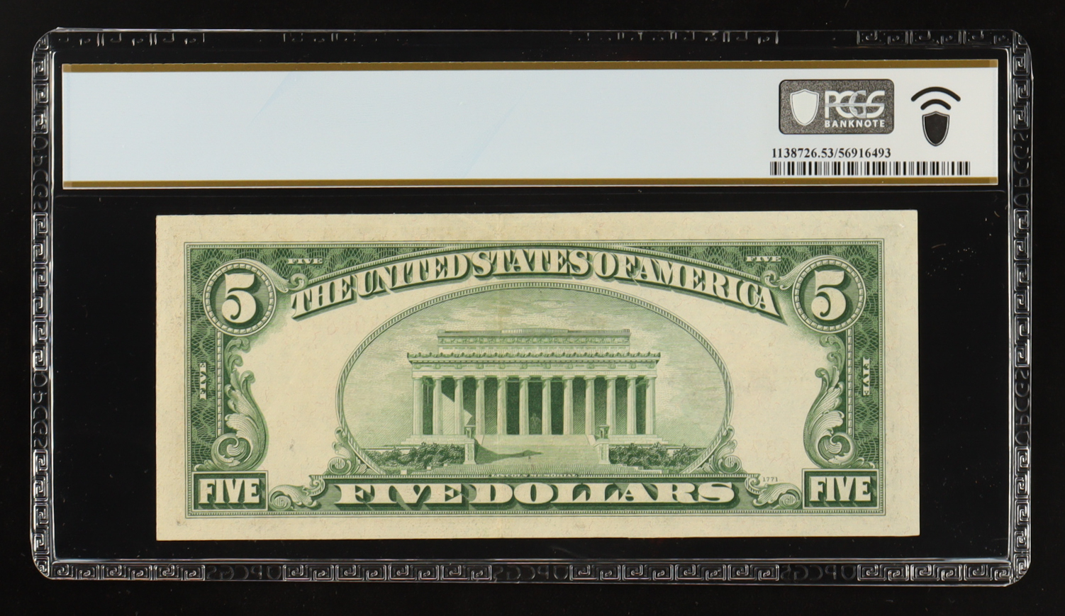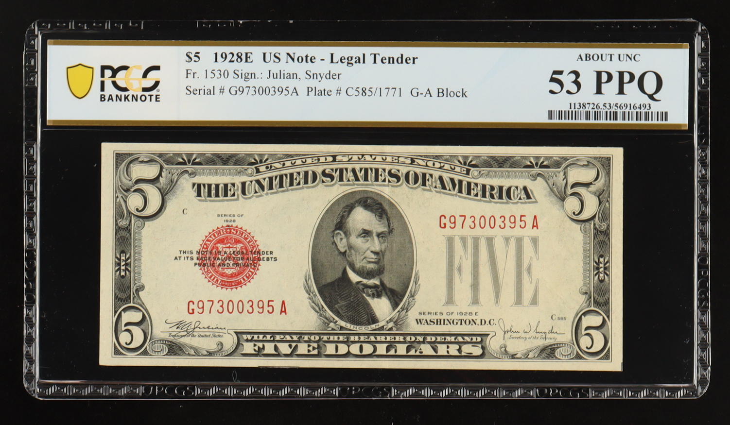 1928-E U.S. $5 Legal Tender Note, Red Seal - Fr. 1530 (GA Block) Signed: Julian / Snyder (PCGS About Unc 53 PPQ)