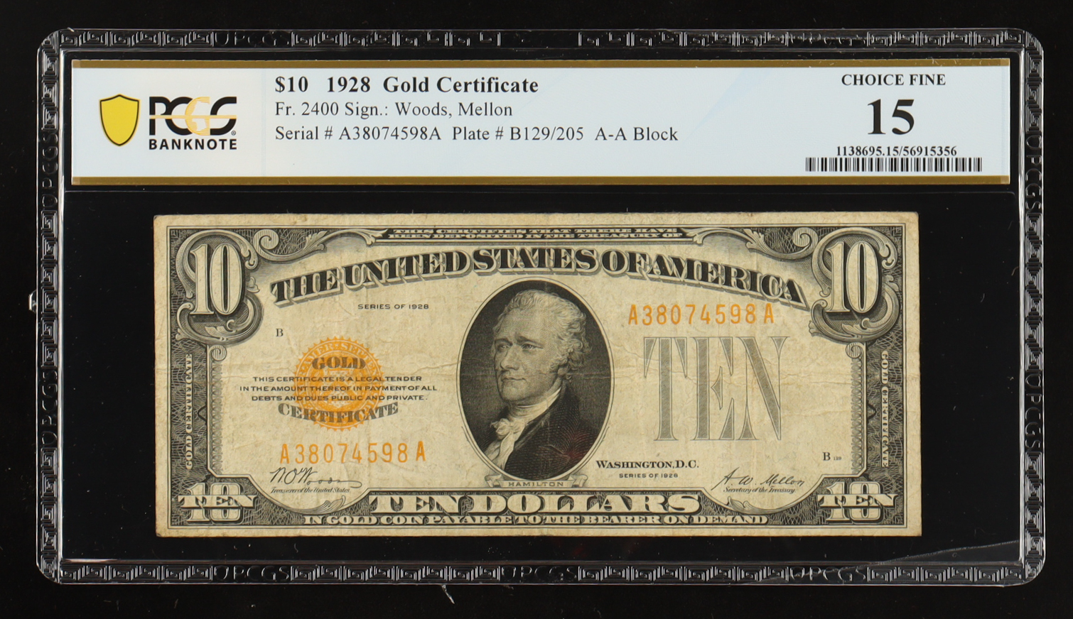 1928 U.S. $10 Gold Certificate - Fr. 2400 (AA Block) Signed: Woods / Mellon (PCGS Choice Fine 15)