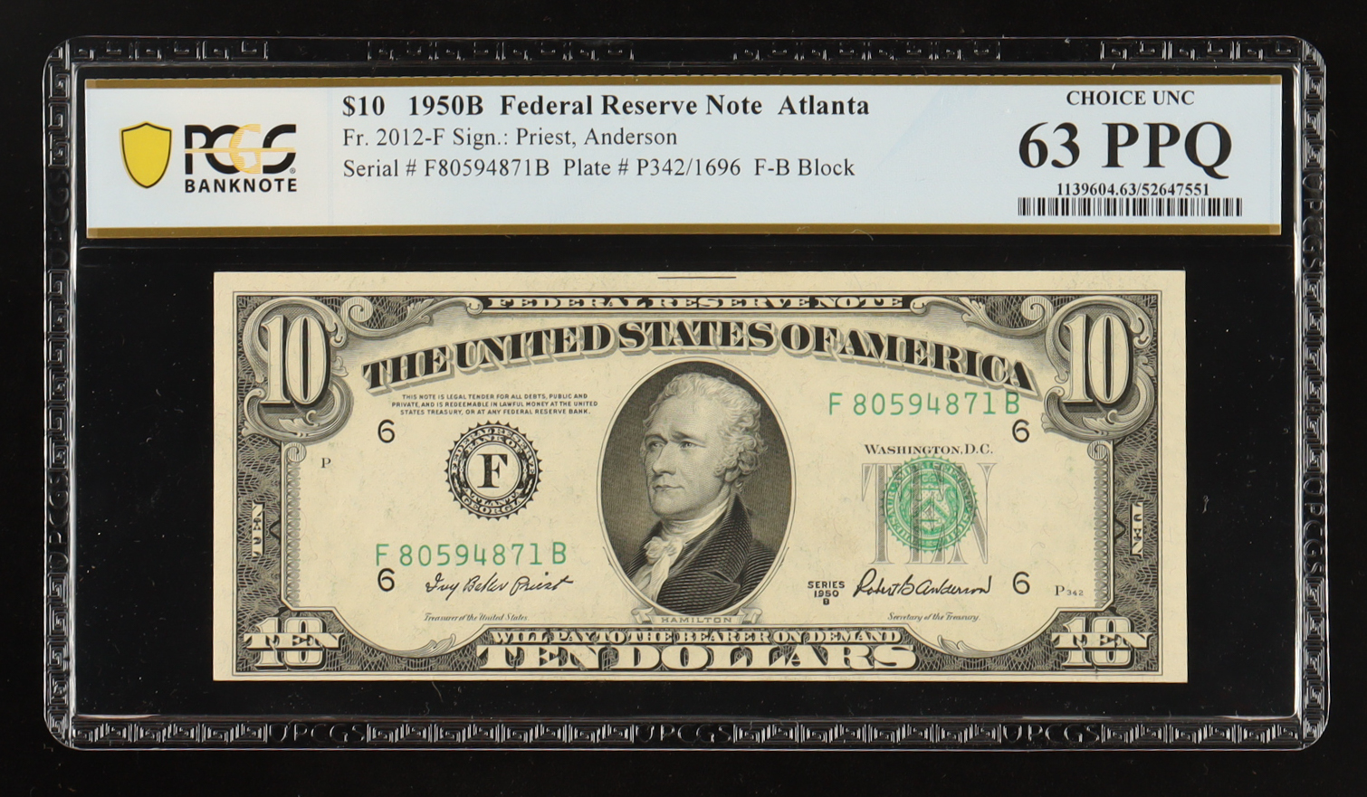 1950-B U.S $10 Federal Reserve Note, Atlanta - Fr. 2012-F (FB Block) Signed: Priest / Anderson (PCGS Choice Unc 63 PPQ)