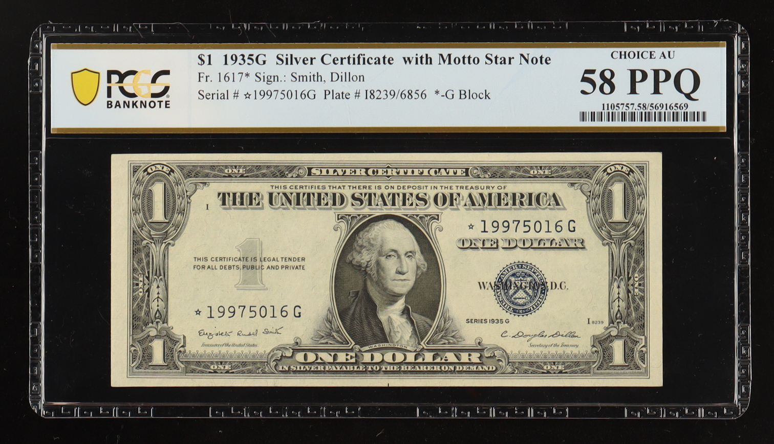 1935-G U.S. $1 Silver Certificate "With Motto" Star Note - Fr. 1617* (*G Block) Signed: Smith / Dillon (PCGS Choice AU 58 PPQ)