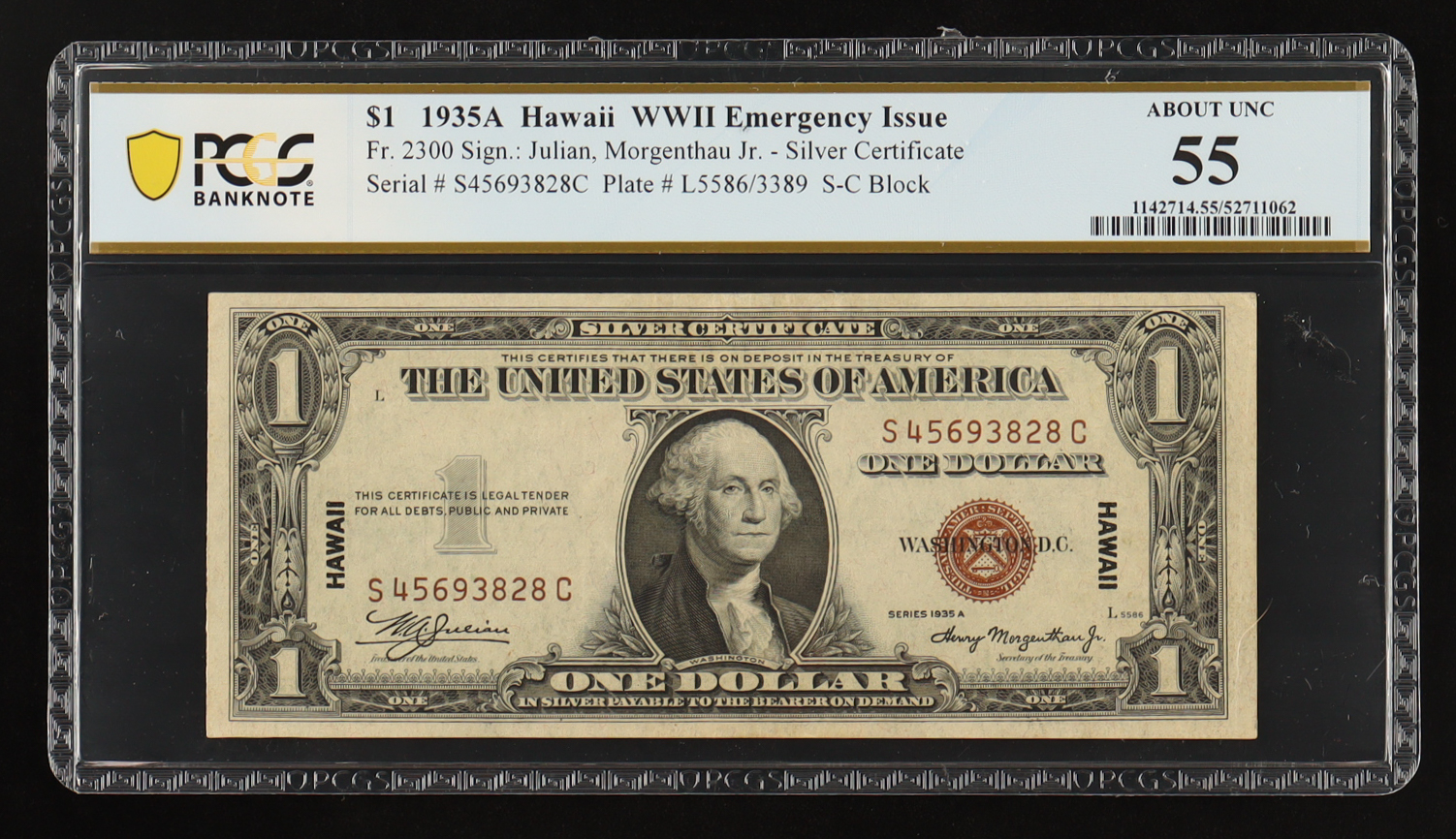 1935-A U.S. $1 Hawaii Silver Certificate - WWII Emergency Issue - Fr. 2300 (SC Block) Signed: Julian / Morgenthau (PCGS About Unc 55)