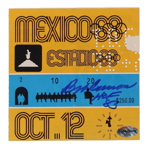 Ticket stub for the opening ceremony of the 1968 Olympics. Hand-signed and inscribed by Bob Beamon.