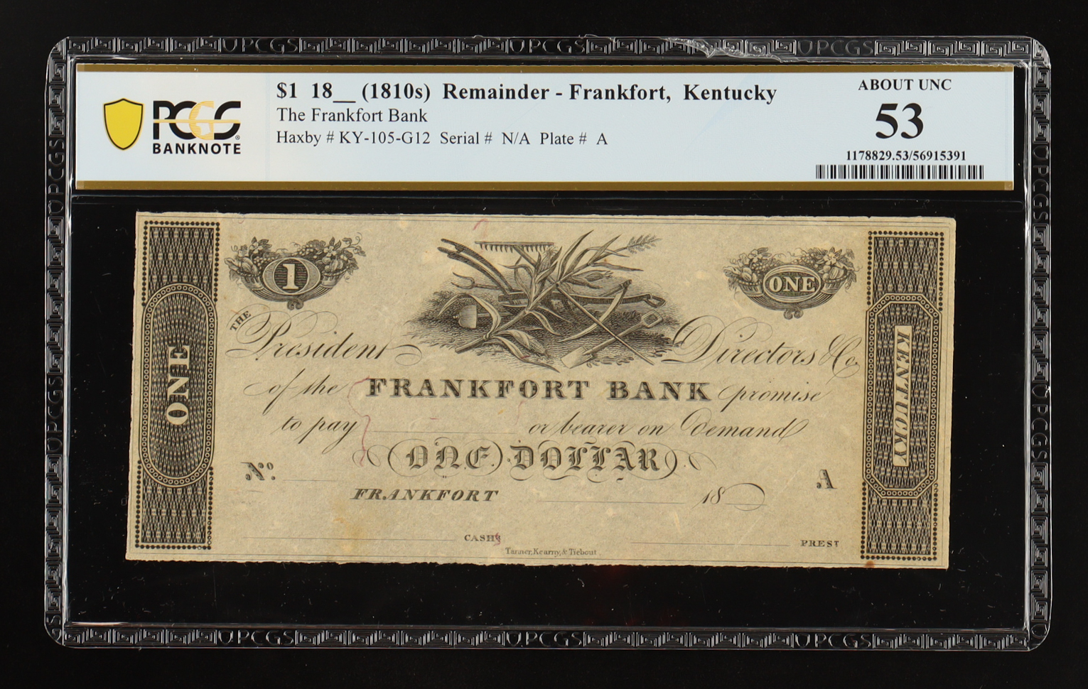 1810s $1 Currency Note, Frankfort, Kentucky - The Frankfort Bank (PCGS About Unc 53)