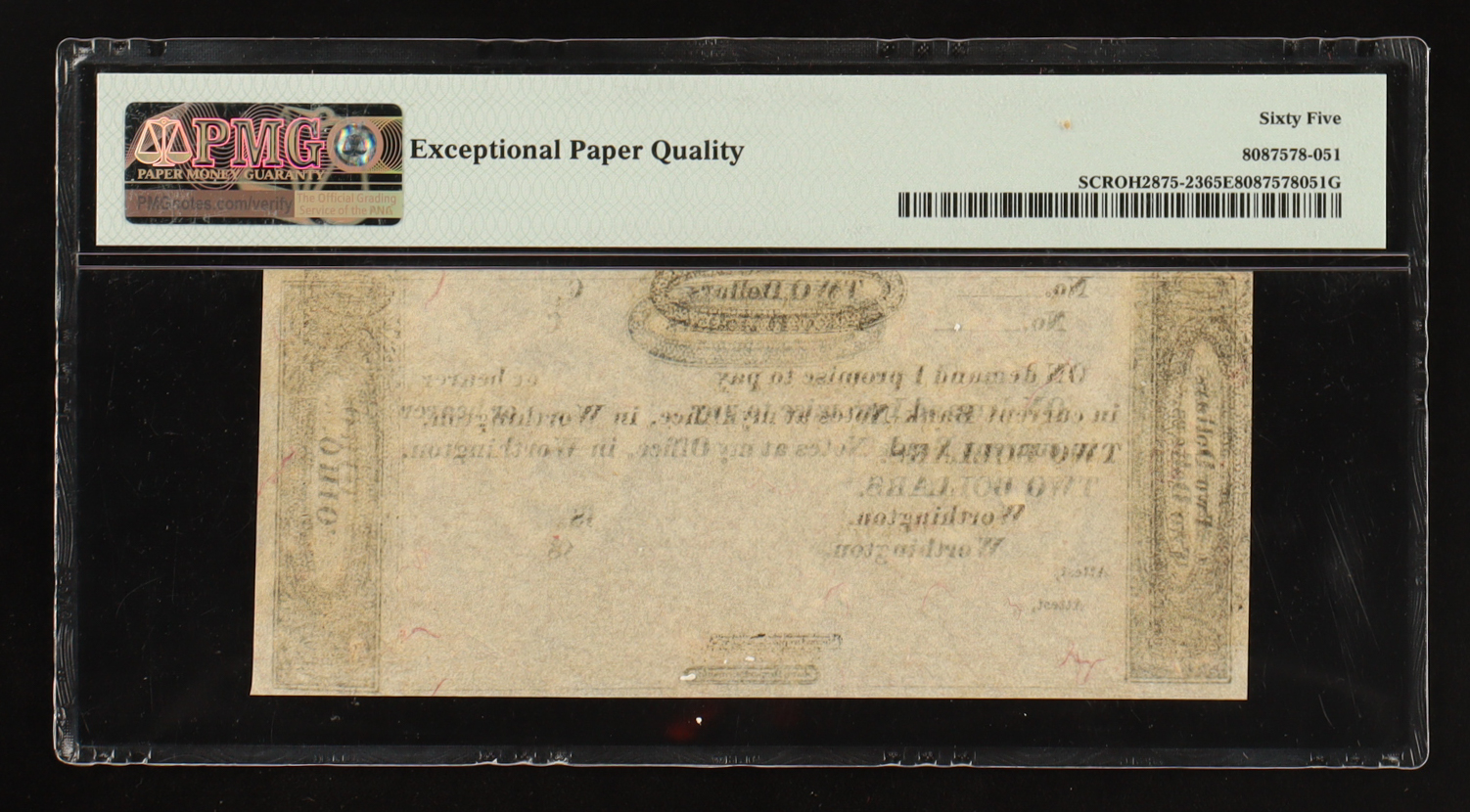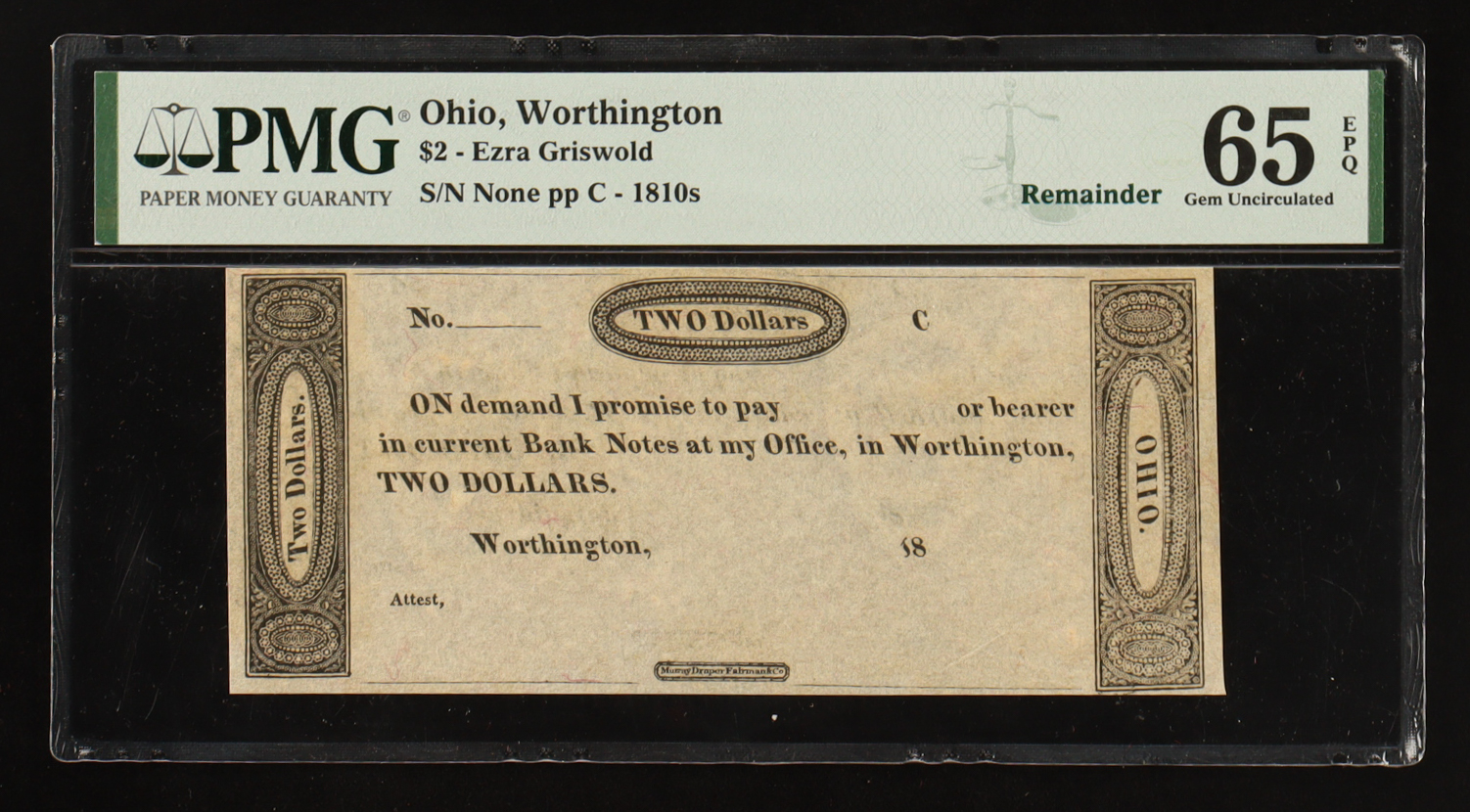 1810s $2 Currency Note, Worthington, Ohio - Ezra Griswold (PMG Gem Uncirculated 65 EPQ)
