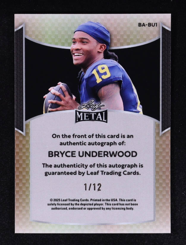 Bryce Underwood 2025 Leaf Metal Football Autographs Blue Lava #BABU1 #1/12 RC