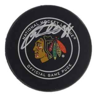 Chicago Blackhawks logo hockey puck. Hand-signed by Patrick Kane.