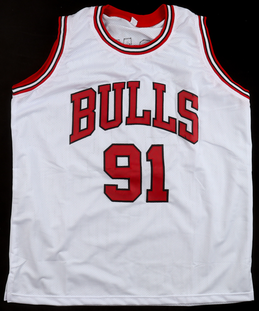 Custom jersey with everything sewn on, size XL. Has been hand-signed by Dennis Rodman (HOF).