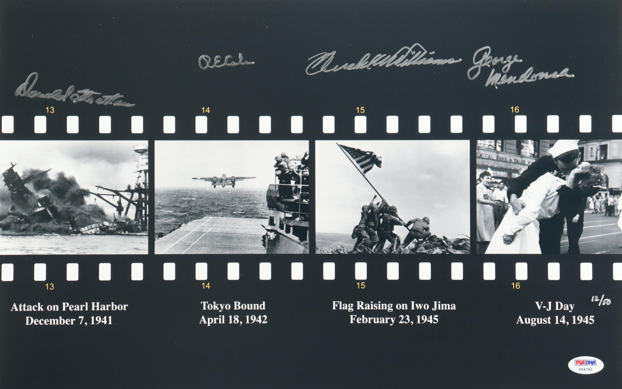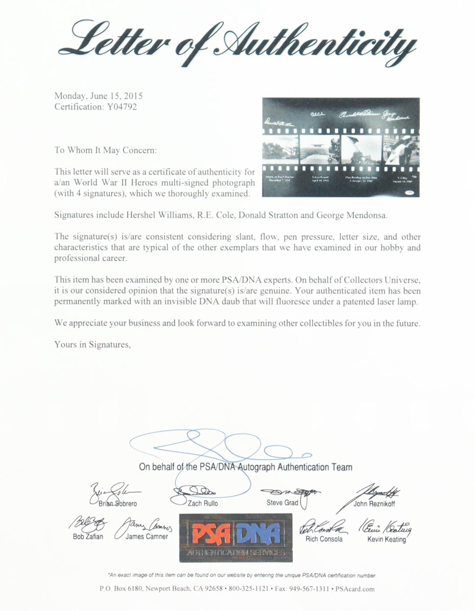Signature include: USS Arizona Donald Stratton, Doolittle Raiders Richard Cole, Iwo Jima Hershel Williams, VJ Day George Mendonsa