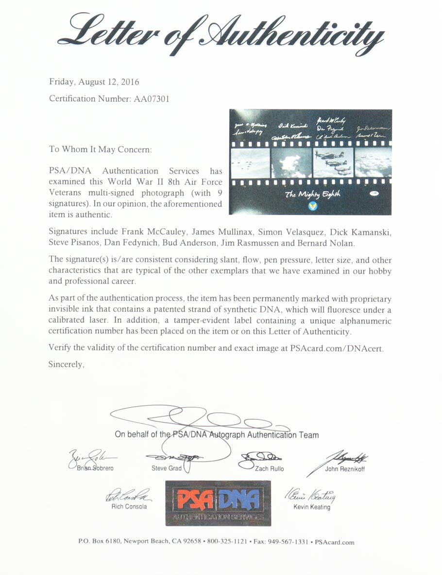 This exceptional 12x18 film strip photograph is hand-signed by nine distinguished veterans of the 8th Air Force, affectionately known as ""The Mighty Eighth."" The signatures include: