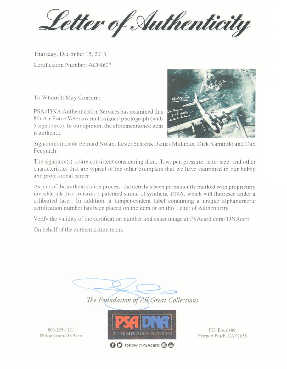This extraordinary 16x20 photograph is hand-signed by five esteemed veterans of the 8th Air Force, known as ""The Mighty Eighth"": Bernard Nolan, Lester Schrenk, James Mullinax, Dick Kaminski, and Dan Fedynich. Each signature adds a personal touch to this remarkable tribute to their valor and service during World War II.