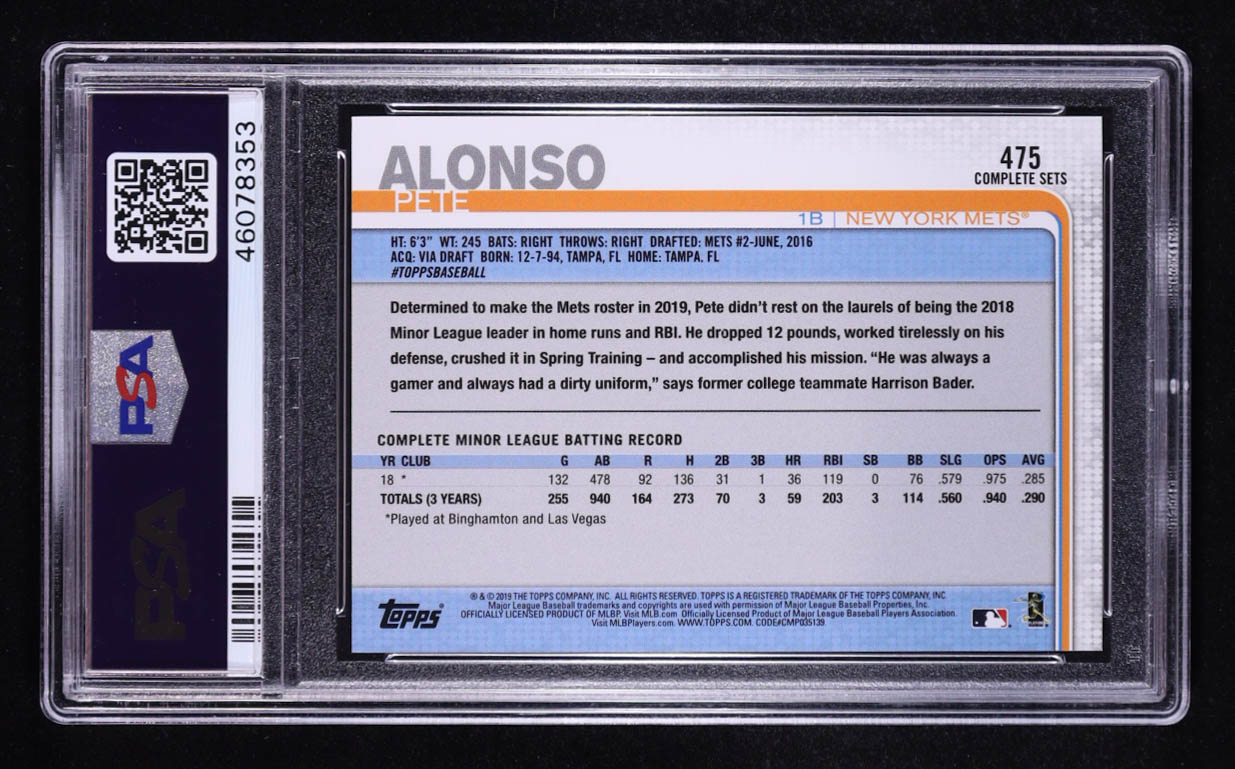 Pete Alonso 2019 Topps Base Set Photo Variations/No sock showing RETAIL FACTORY #475 RC (PSA 10)