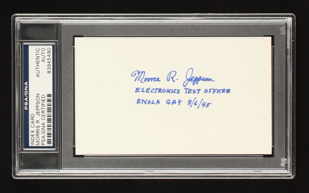 Offered for auction is an **authentic hand-signed index card by WWII veteran Morris R. Jeppson**, Weapons Test Officer aboard the *Enola Gay* during the historic Hiroshima mission. The card is **encapsulated and authenticated by PSA/DNA Authentication Services**, ensuring its authenticity and preservation.
