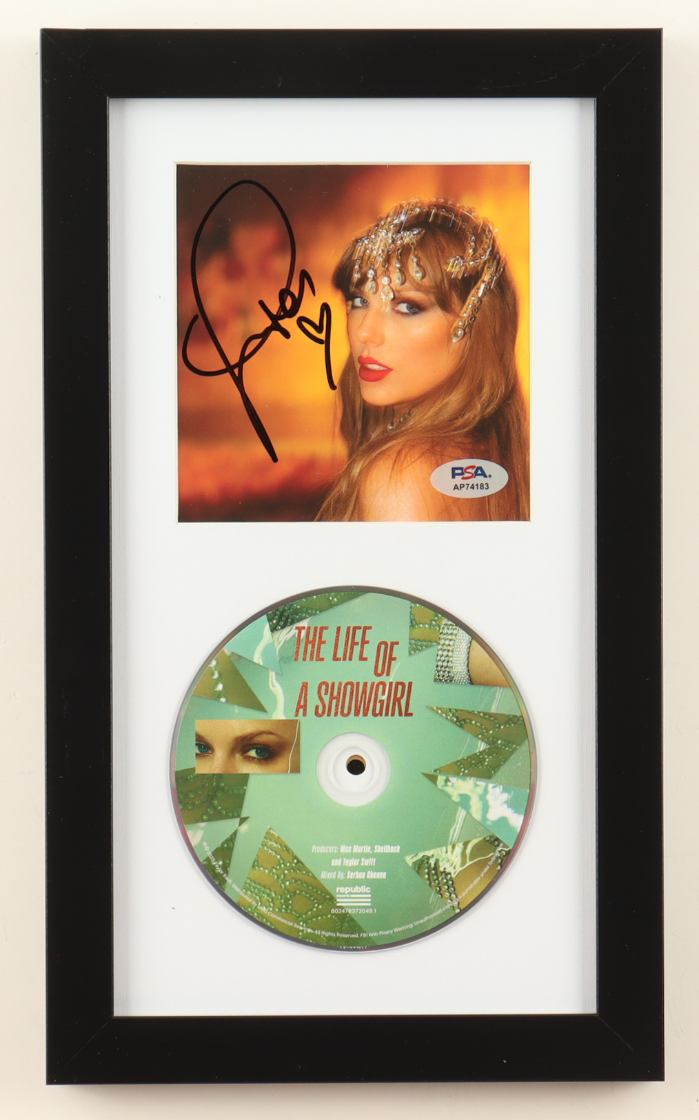 Custom frame measures 8" x 13" in size. "The Life of a Showgirl" CD album slipcover has been hand-signed by Taylor Swift. Display also includes the CD.