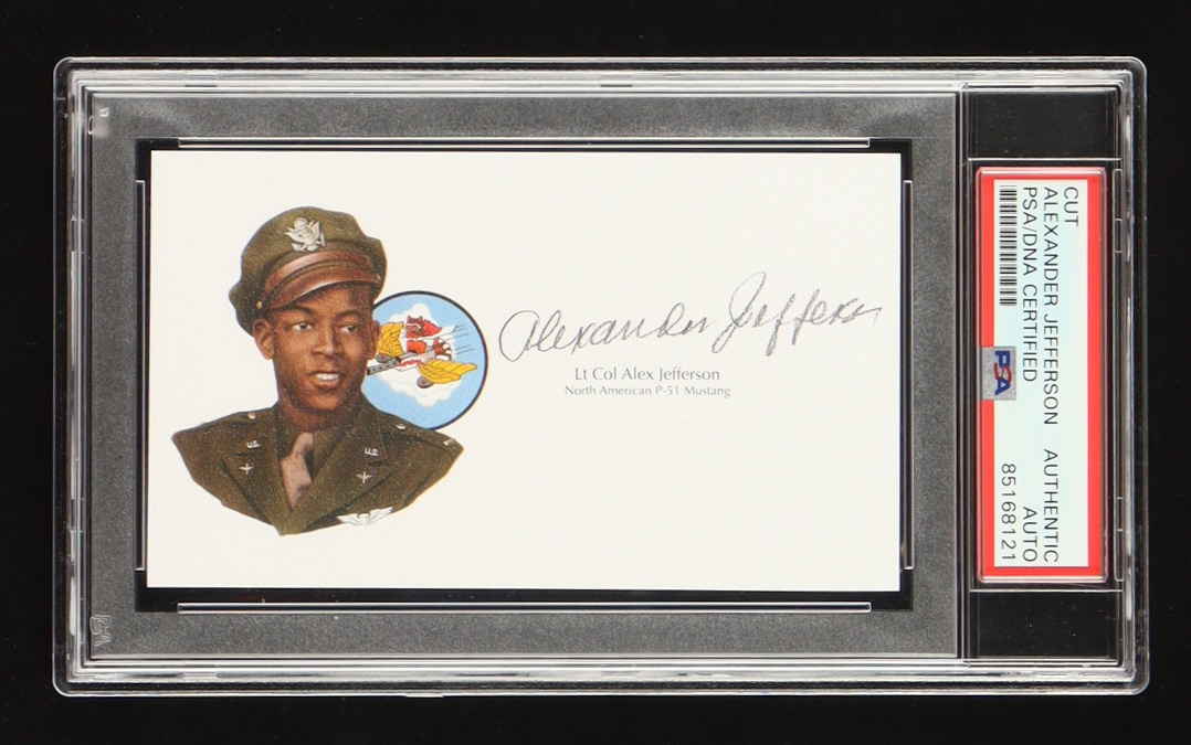 "Up for auction is a hand-signed 3x5 cut signature by Tuskegee Airman and distinguished P-51 pilot, Lieutenant Colonel Alexander Jefferson. This signature is authenticated and encapsulated by PSA/DNA authentication services, ensuring its authenticity and long-term preservation.