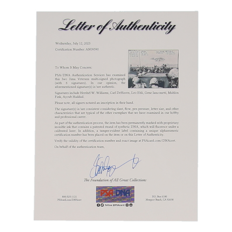 This powerful 11x14 photograph of the iconic Iwo Jima invasion is hand-signed by six distinguished United States Marine Corps veterans who bravely served during this pivotal battle in World War II. The veterans include Hershel ""Woody"" Williams, Carl DeHaven, Leo Ehli, Gene Ianconetti, Mahlon Fink, and Ayoub Haddad. Each signature commemorates the heroism and sacrifice of the men who fought in one of the most critical battles of the Pacific Theater. Authenticated by PSA/DNA, this photograph comes with a Letter of Authenticity, ensuring the provenance and significance of this historic piece.