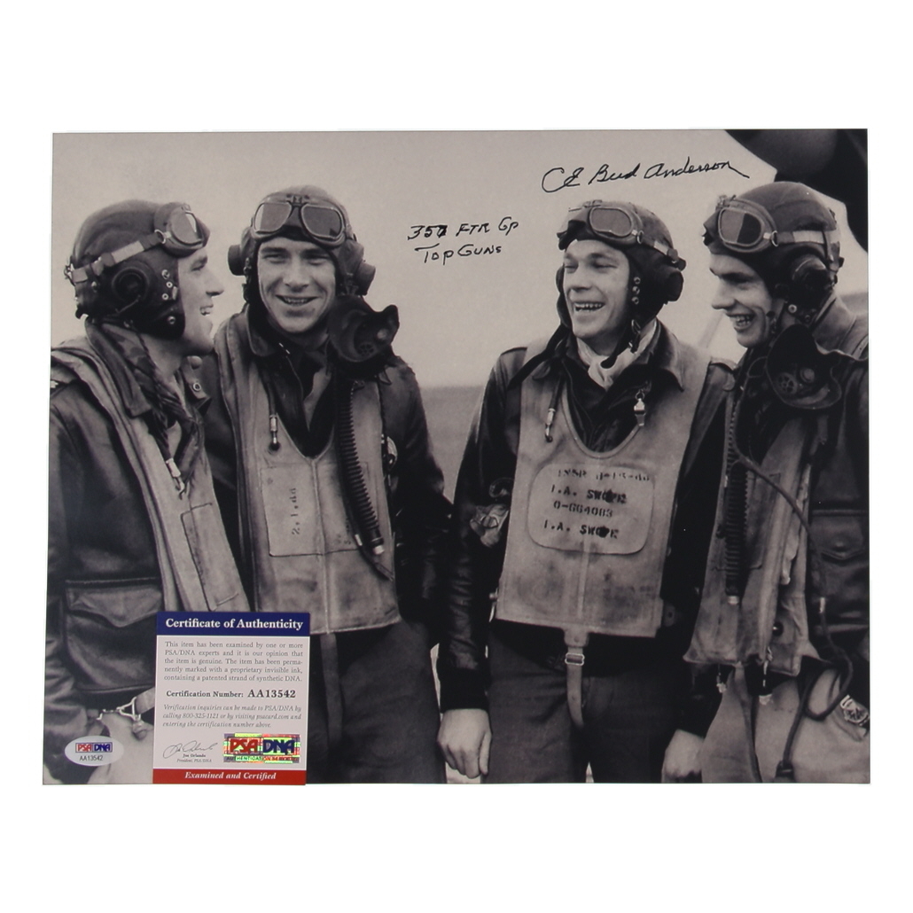 Presented is a hand-signed 11x14 photograph by Colonel Clarence Emil “Bud” Anderson (1922–2023), one of America’s most celebrated World War II fighter aces and a triple ace of the 357th Fighter Group, “Yoxford Boys.” Anderson has personally inscribed the photograph “357th FG Top Guns” alongside his bold signature. The autograph has been authenticated by PSA/DNA and comes with their Certificate of Authenticity, ensuring both verification and long-term preservation.