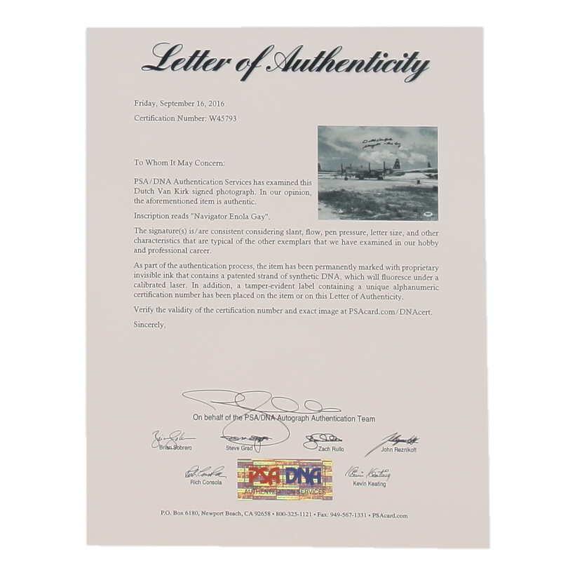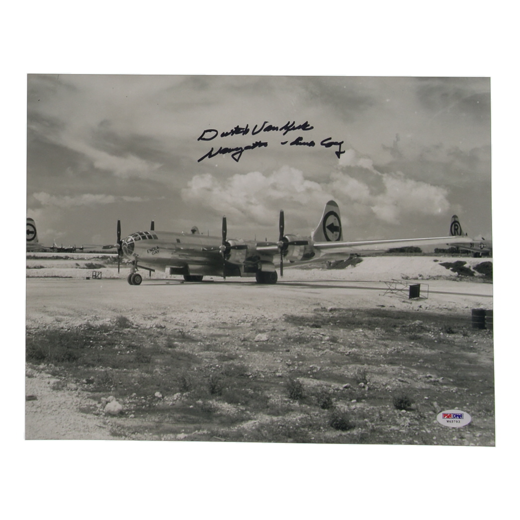 Presented is a hand-signed 11x14 photograph by Major Theodore “Dutch” Van Kirk (1921–2014), the navigator of the B-29 Superfortress Enola Gay, the aircraft that dropped the first atomic bomb on Hiroshima, Japan, on August 6, 1945. Van Kirk has personally inscribed the photograph “Navigator – Enola Gay” beneath his signature. The autograph has been authenticated by PSA/DNA and is accompanied by their Letter of Authenticity, ensuring both verification and long-term preservation.