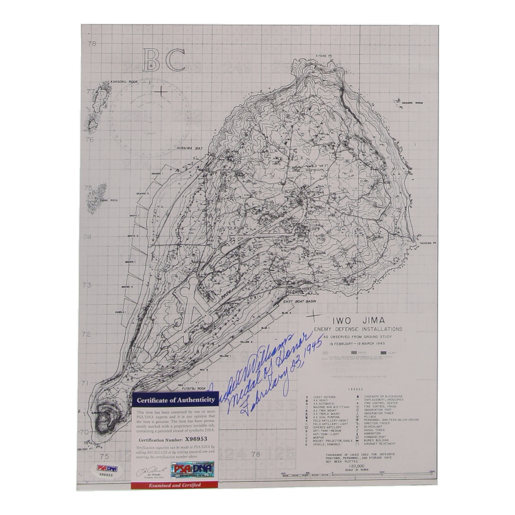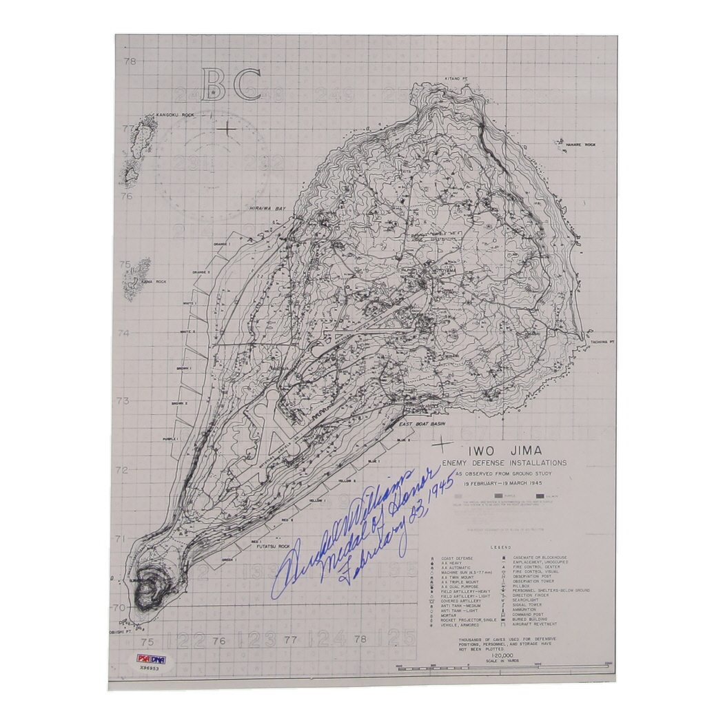 Presented is a hand-signed 11x14 photograph titled “Iwo Jima: Enemy Defense Installations,” personally autographed and inscribed by Corporal Hershel W. “Woody” Williams (1923–2022), United States Marine Corps Medal of Honor Recipient. Williams has added the historic inscription: