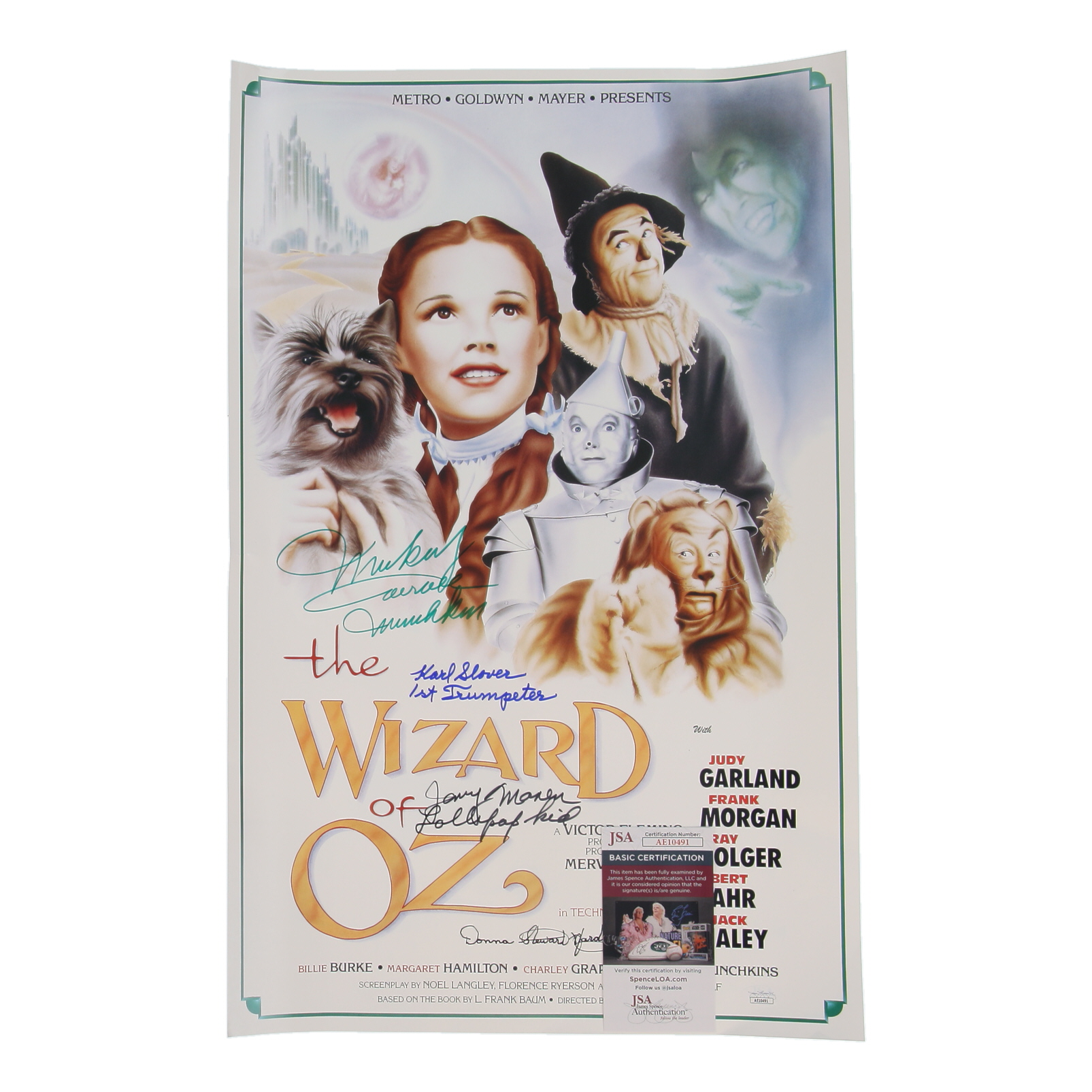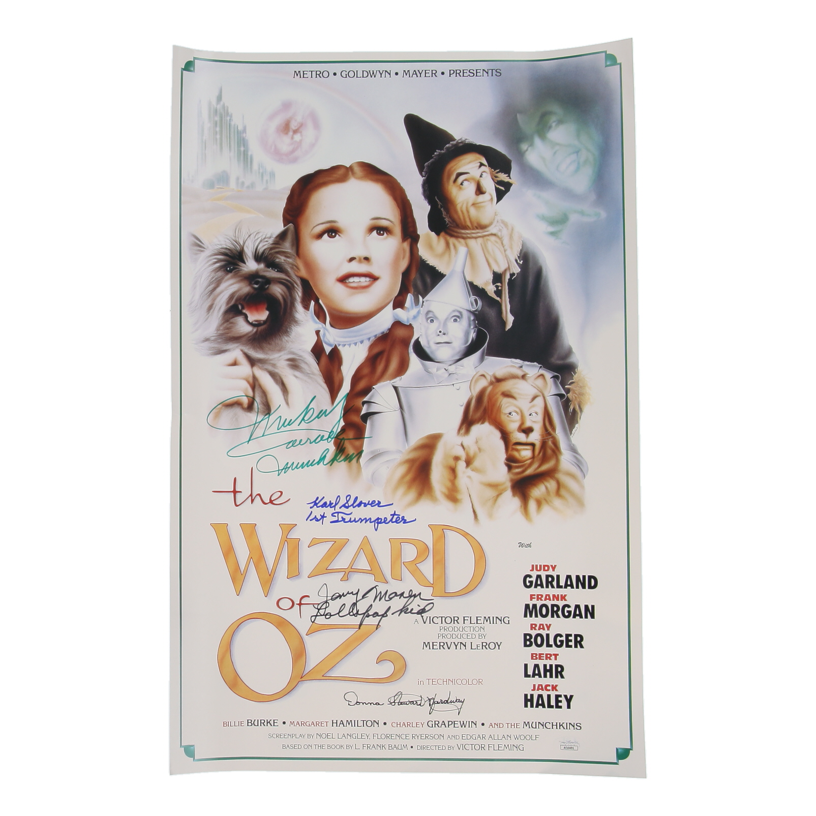 Poster measures approximately 16" x 24" in size and has been hand-signed and inscribed by Mickey Carroll (D. 2009), Jerry Maren (D. 2018), Karl Slover (D. 2011), and Donna Stewart Hardway (D. 2008).