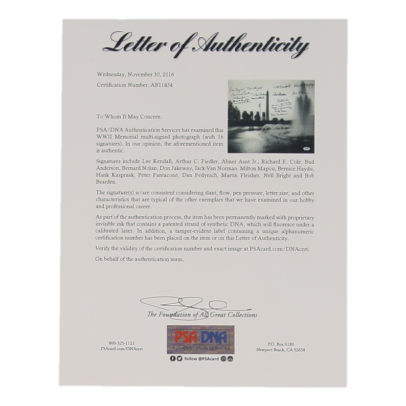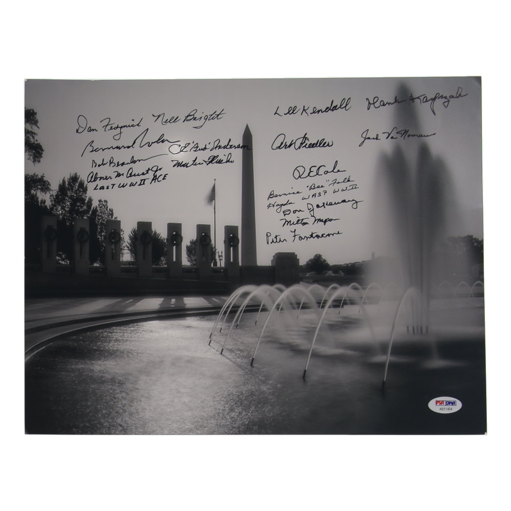 Presented is a hand-signed 11x14 photograph of the National World War II Memorial, personally autographed by sixteen distinguished World War II veterans, representing an extraordinary cross-section of America’s Greatest Generation. Each signer played a vital role in the air, land, and sea campaigns that defined victory in the Second World War. The photograph has been authenticated by PSA/DNA and is accompanied by their Letter of Authenticity, ensuring both verification and long-term preservation.