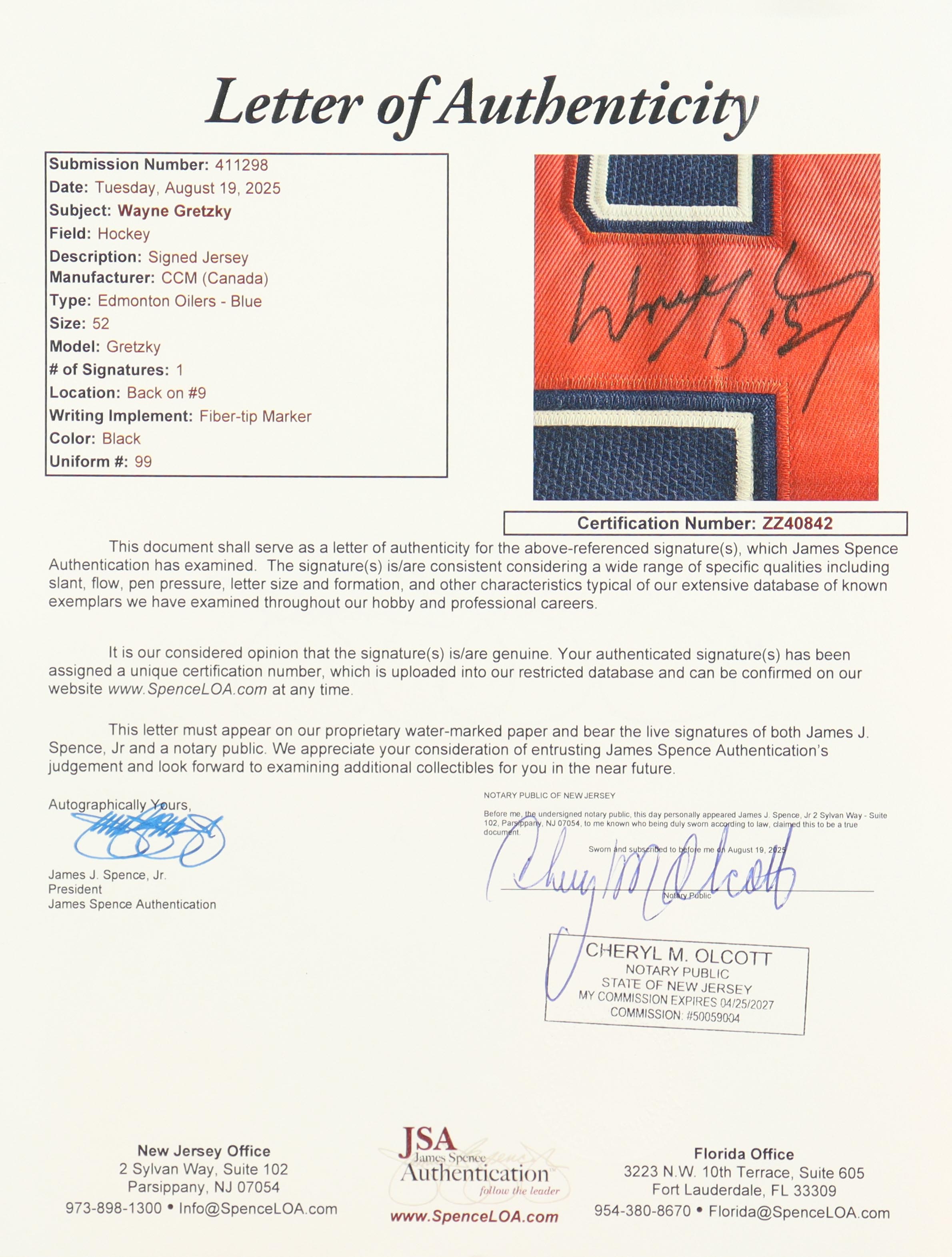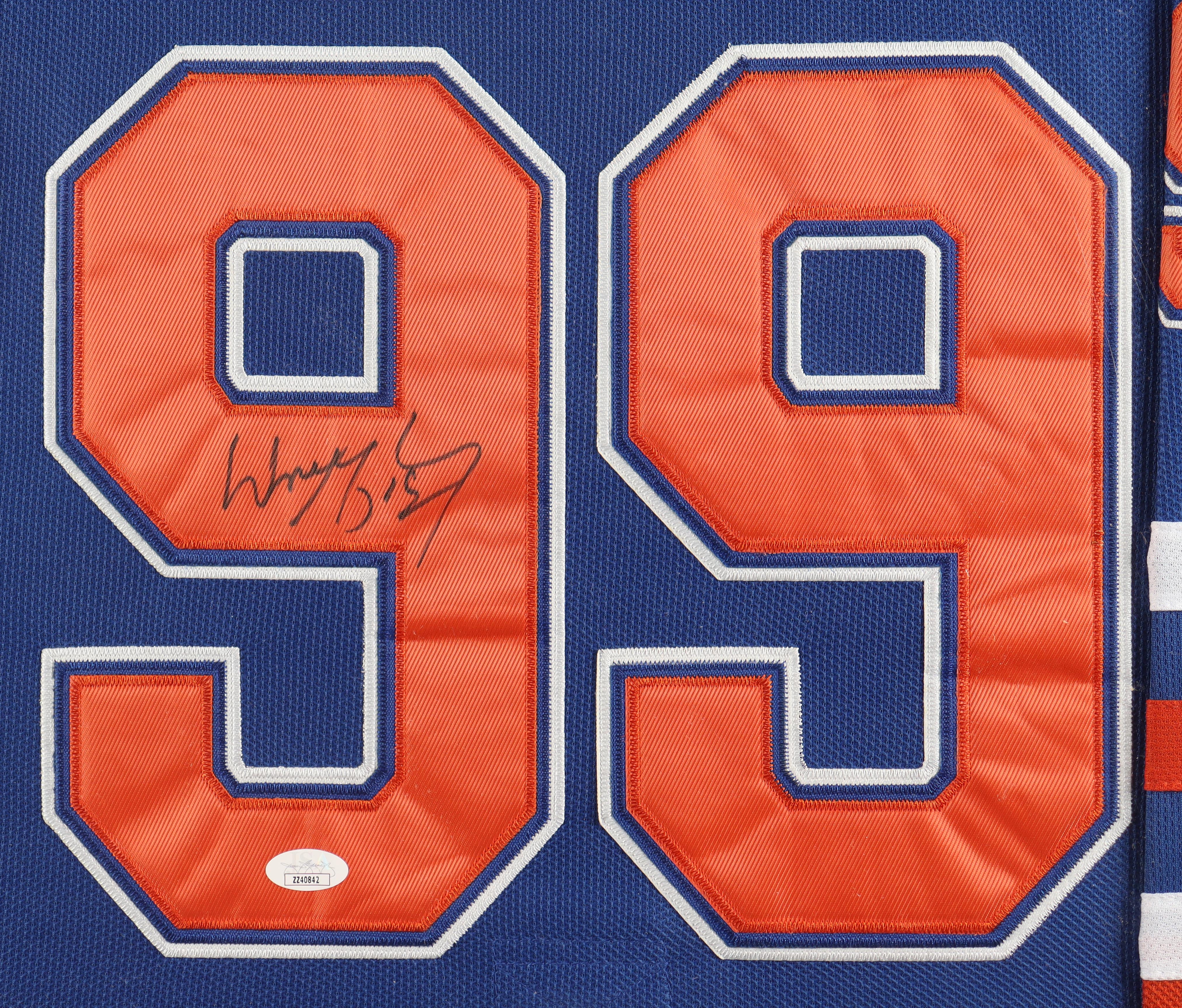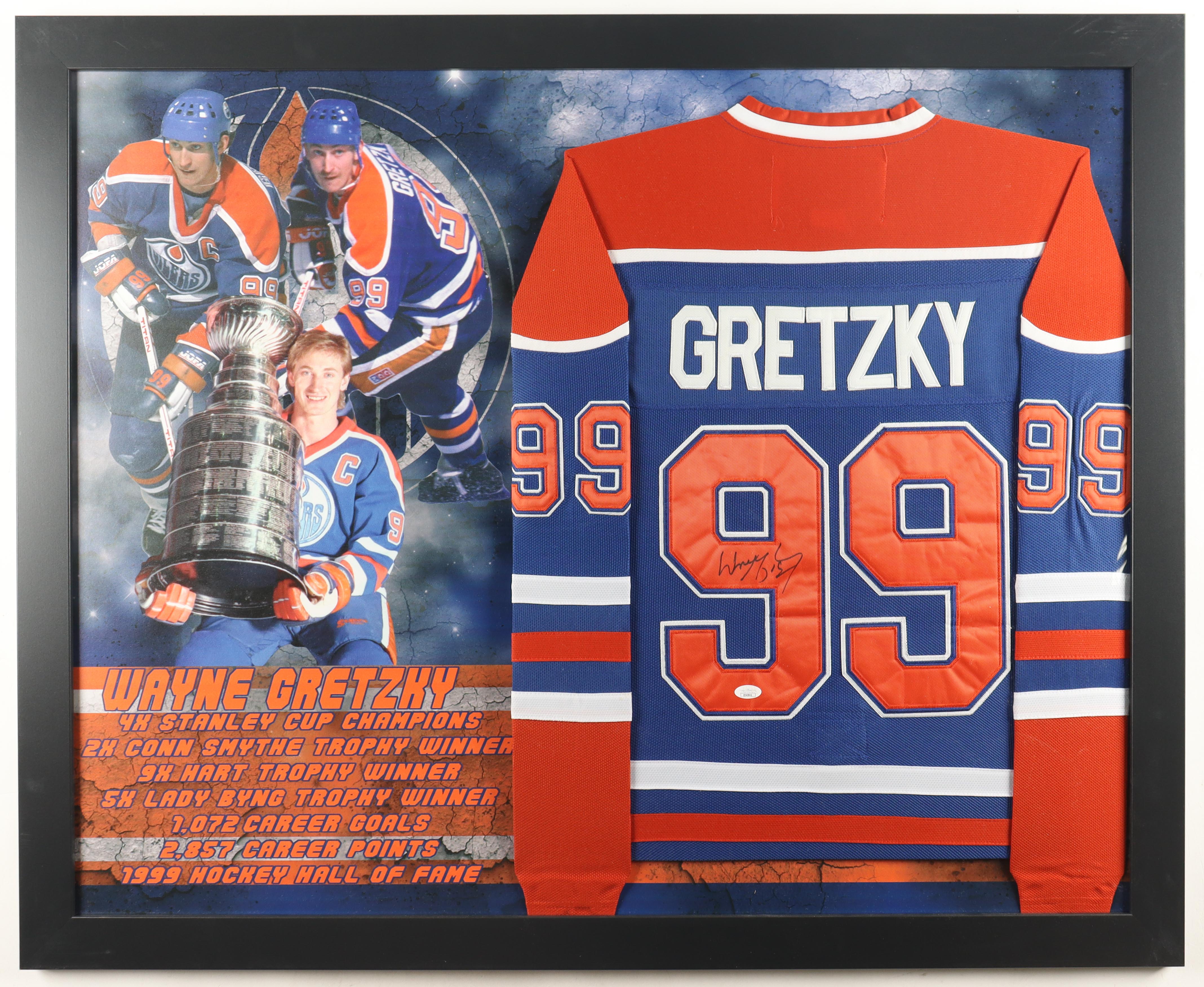 Custom frame measures approximately 35.5" x 43.5" in size and features a jersey that has been hand-signed by Edmonton Oilers legend, Wayne Gretzky!