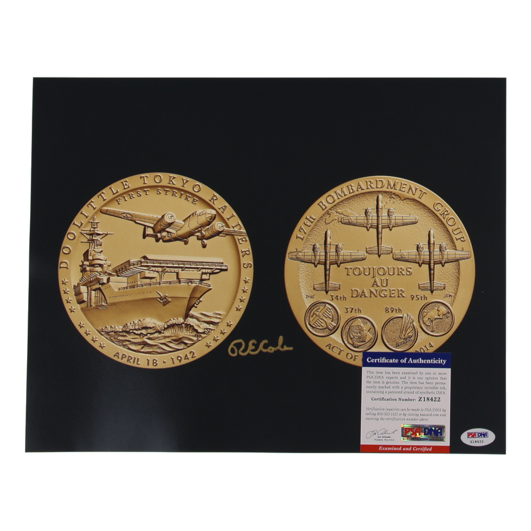 Presented is a hand-signed 11x14 photograph featuring the Congressional Gold Medal awarded to the Doolittle Raiders, personally autographed by Lieutenant Colonel Richard E. Cole (1915–2019), the co-pilot of Plane #1 on the historic Doolittle Raid—the first U.S. air attack on Japan during World War II. The signature has been authenticated by PSA/DNA and is accompanied by their Certificate of Authenticity, ensuring both verification and long-term preservation.